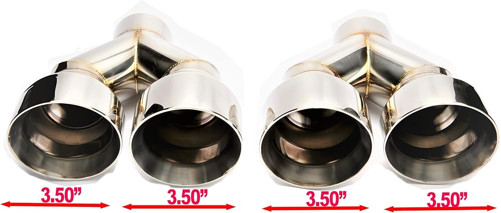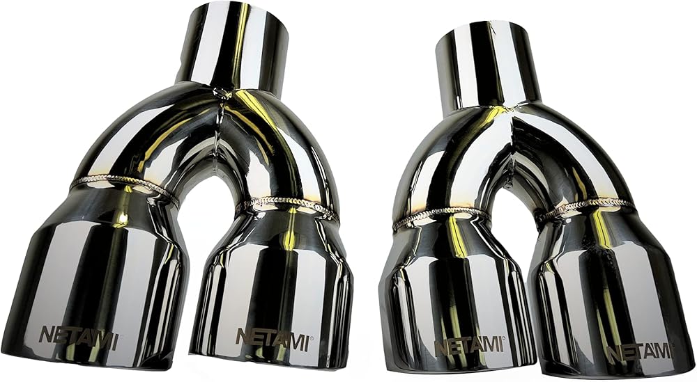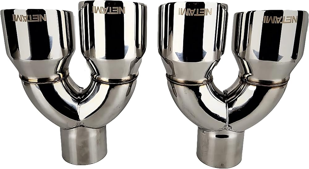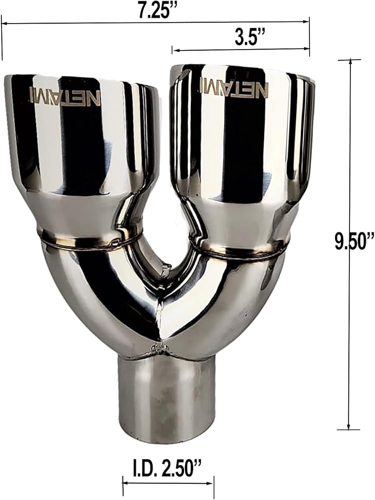 NETAMI premium T304 quality stainless steel double wall exhaust tips feature mirror polished and precision welded will never rust or fade. This distinctive styling exhaust tip will provide a unique sound and custom look for your vehicle.. Whether you're looking for exhaust tip for cars, SUVs or trucks, NETAMI has you covered with a wide variety of sizes and styles to choose from. Product Configuration: 2.5" Inlet diameter, 3.5" Dual outlet diameter, 9.5" overall length