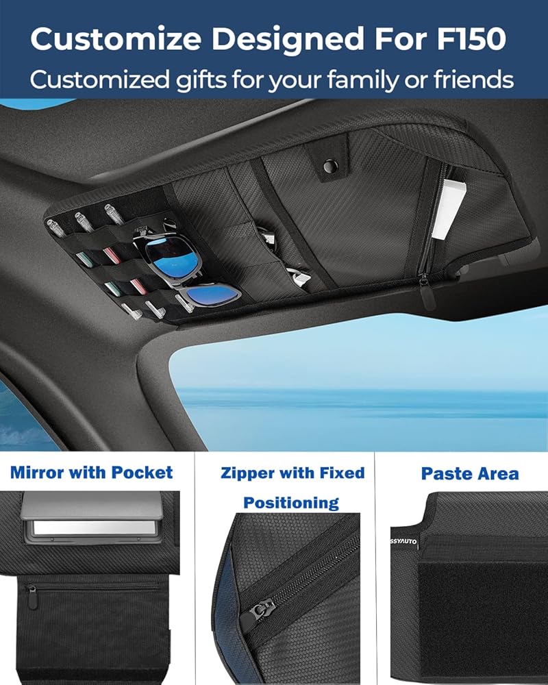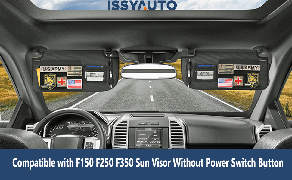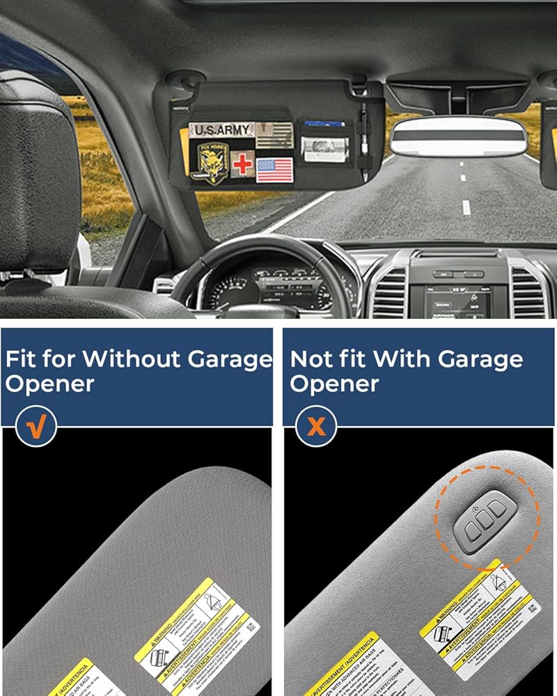 【تصميم مخصص للشاحنة F150】منظم واقي الشمس للسائق متوافق مع f150 f250 f350 بدون لوحة قناع فتاحة المرآب، الأبعاد: 17.8 بوصة طول * 7 بوصة عرض. أحزمة كبيرة وقوية ذاتية اللصق تجعل من السهل وضع واقي الشمس الخاص بك