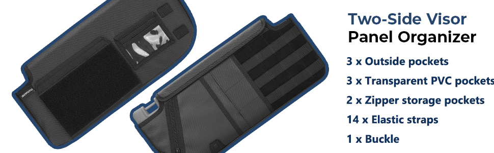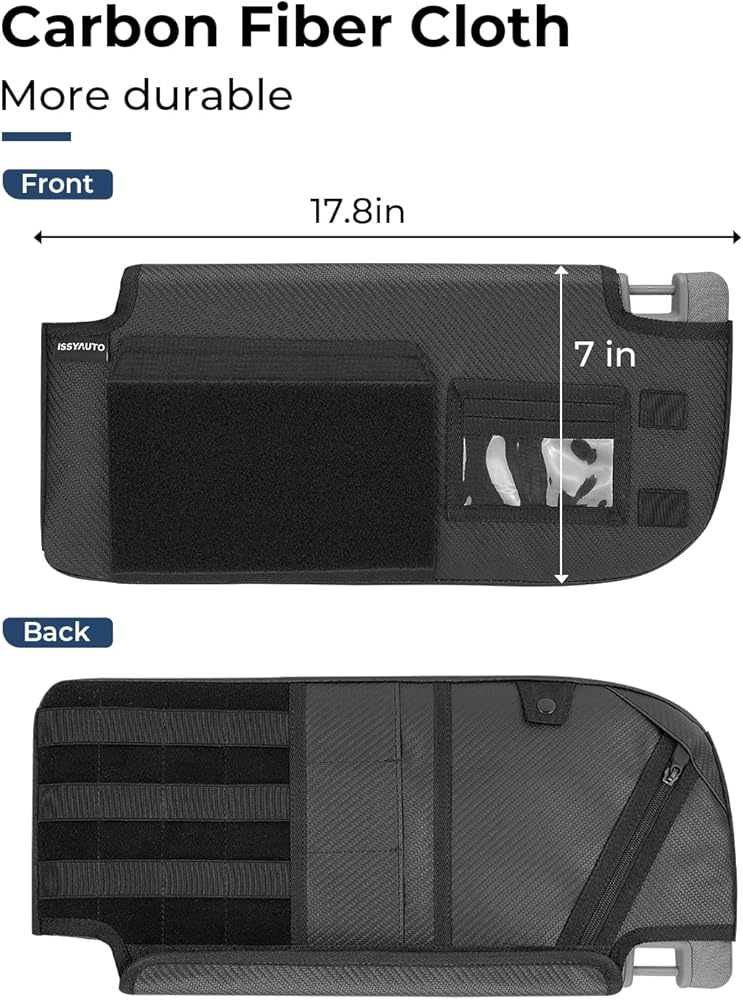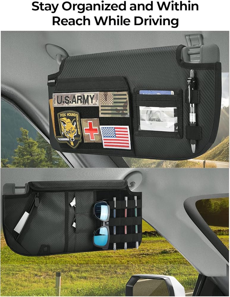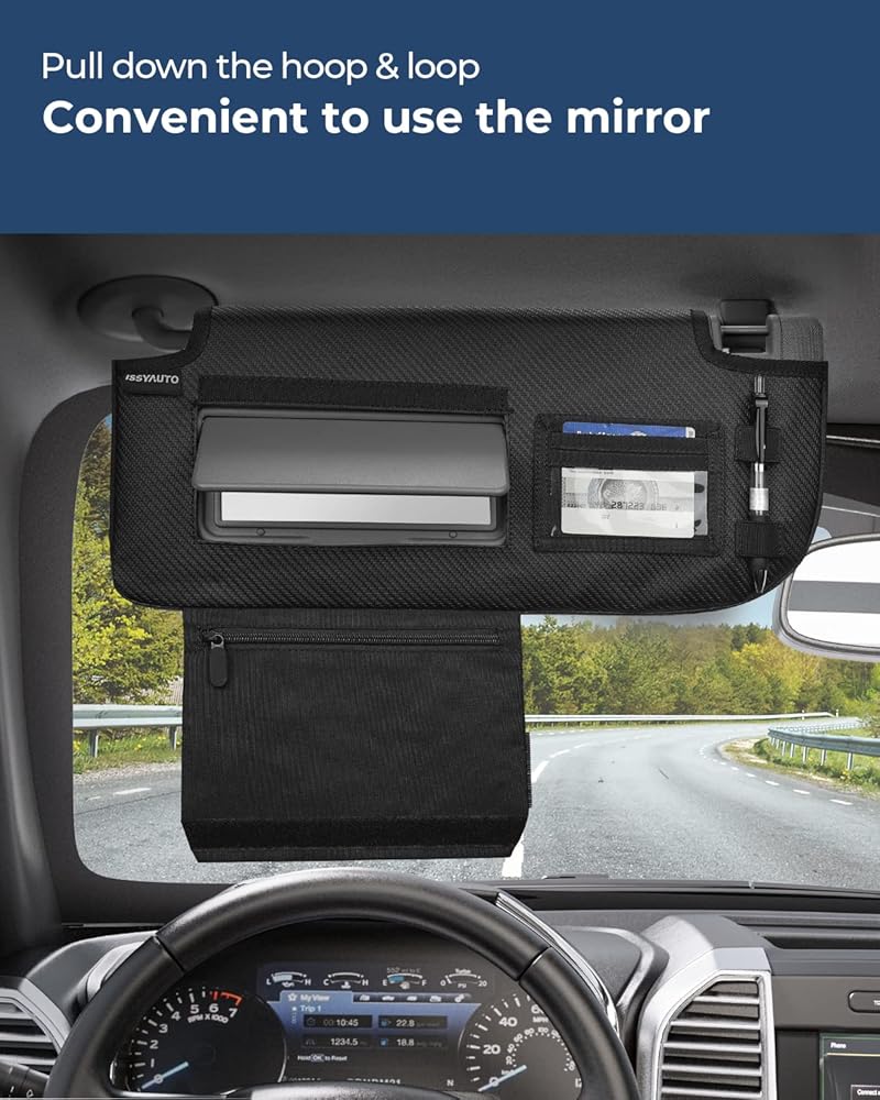 【تصميم مزدوج بالكامل】يبقى حامل واقي الشمس للسيارة ثابتًا في مكانه ويحمل النظارات الشمسية والأقلام والمفاتيح وبطاقات الغاز والتسجيل وحتى الأقنعة بشكل جيد. تحتوي على مساحة كافية لجميع العناصر المهمة التي يتم استخدامها بشكل متكرر أثناء القيادة.