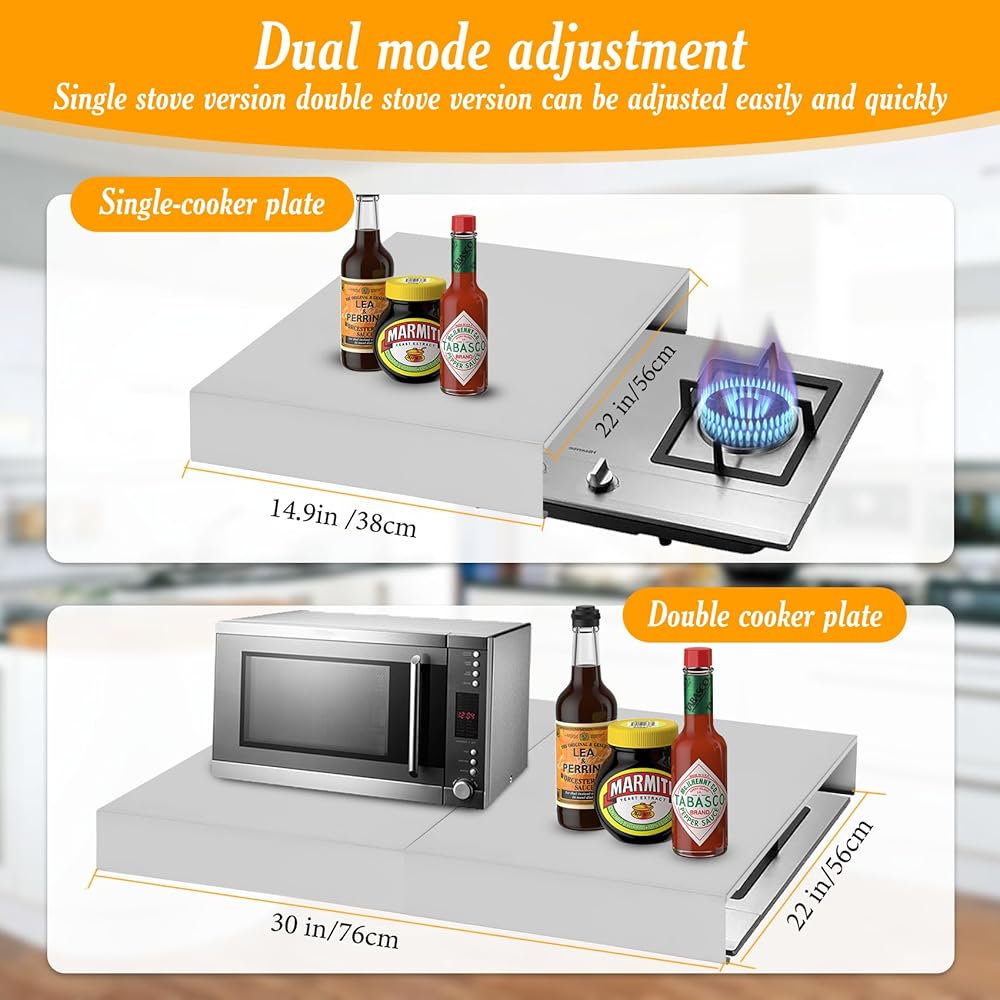 【Multifunctional】Stove covers have different ways to use the furnace plate cover, the size design is reasonable, you can easily adjust according to the needs of the furnace plate cover to adapt to single or double burner furnaces. Makes stainless steel stove cover easy and quick to add to your kitchen.