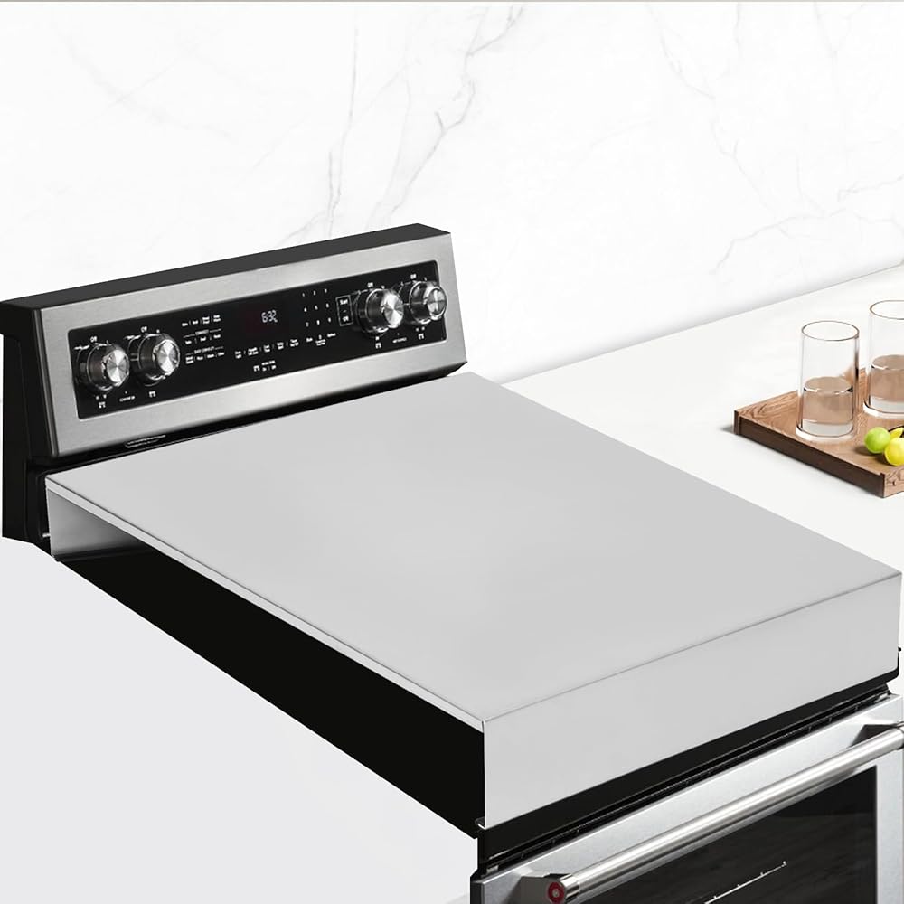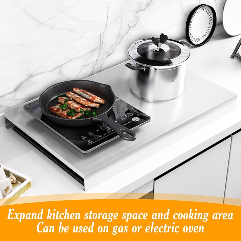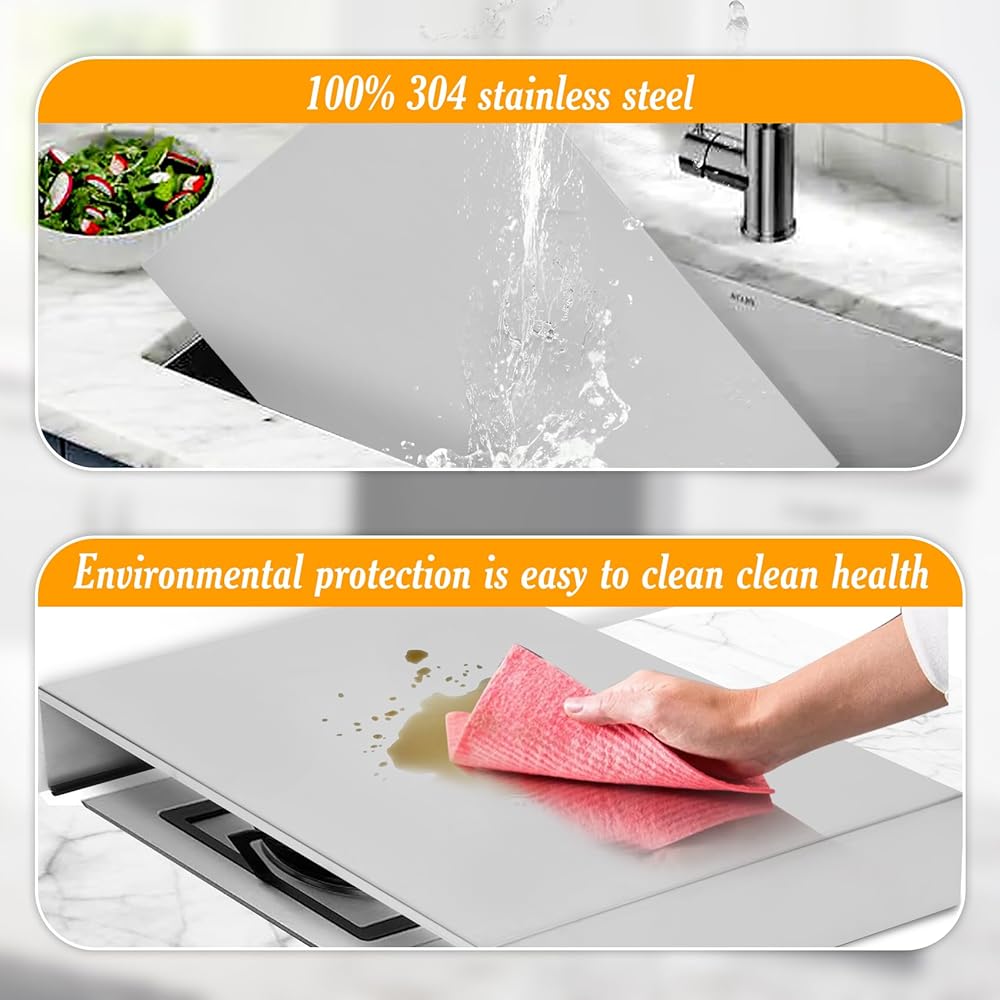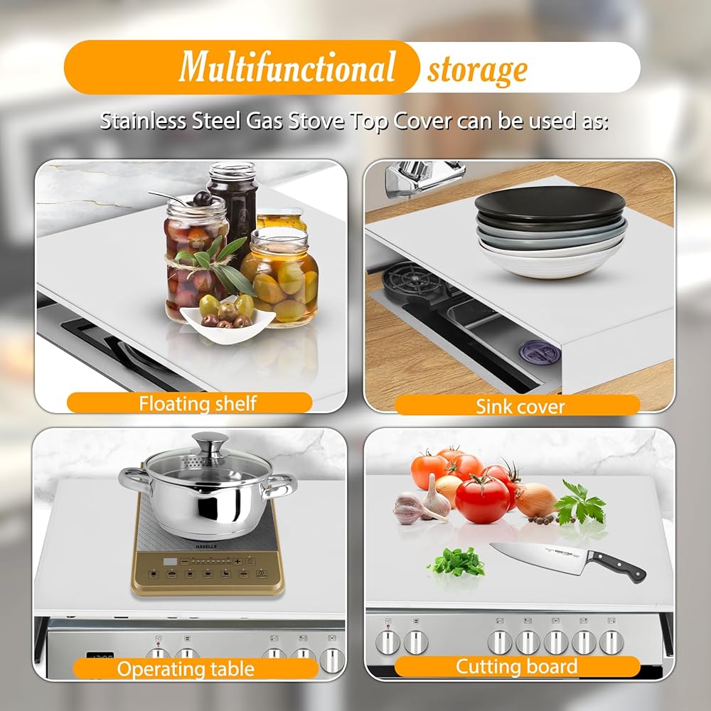 【Expand operating space】 Gas stove top covers can expand your kitchen storage and cooking area! Stove covers can be placed on top of an electric oven and air stove, stove board cover give you a convenient workbench while also providing a smooth storage space for your cooking tools. Stainless steel stove cover can be used to place your cookware or as a cutting board, serving tray, or sink cover.