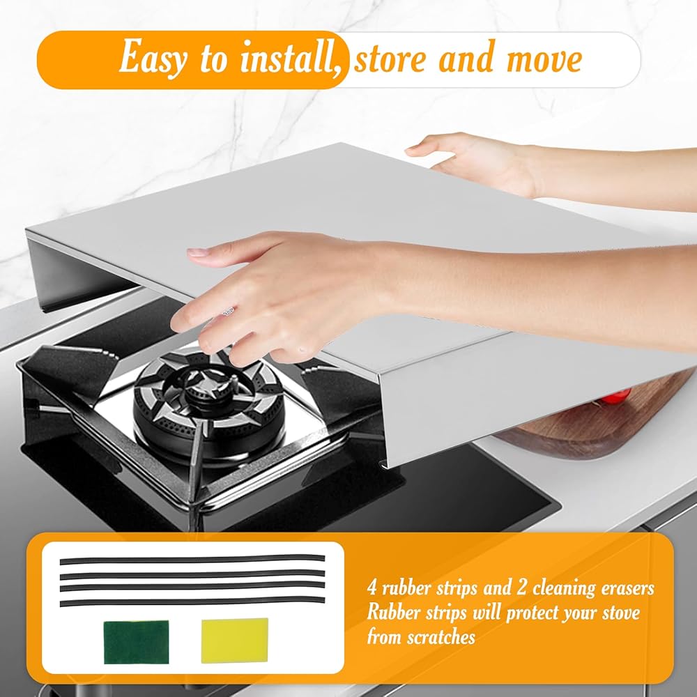 【What you will receive】 2 stainless steel stove covers with four rubber feet and two cleaning sponges, rubber strips can act as protection. Make sure it stays in place during use.