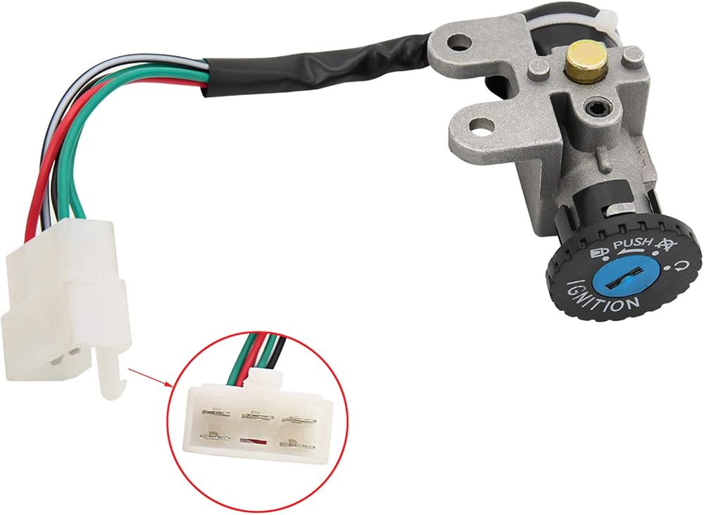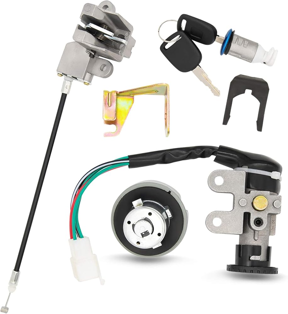 • Package indcluding: key ignition with 5 wires,set of 2 keys,gas tank cap lock,seat lock and mounting clip,seat latch and cable assembly