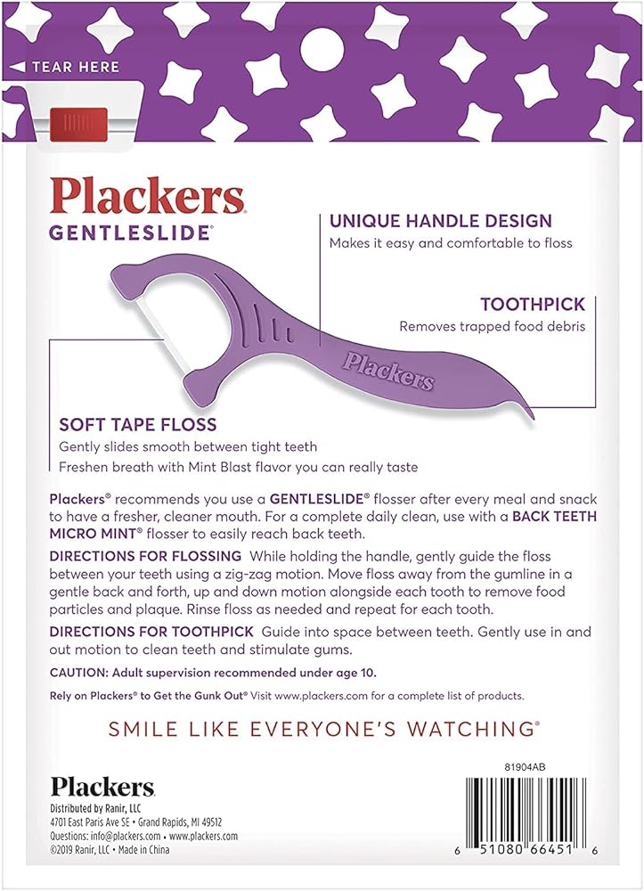 Flossing between tight teeth is no problem with Plackers Gentleslide Flossers. This thin, gentle, dental floss slides smoothly between tight teeth and cleans sensitive gums with a gentle touch for those who need it.