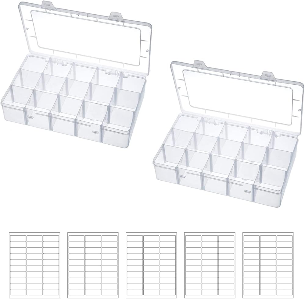 • TRANSPARENT STRAGE BOX SIZE: The size of the box is 10.8"L x 6.4"W x 2.2"H, and the grid size is 2"L x 2"W x 2"H. Come with 5 sheet of stickers, 150 pcs Adhesive labels.