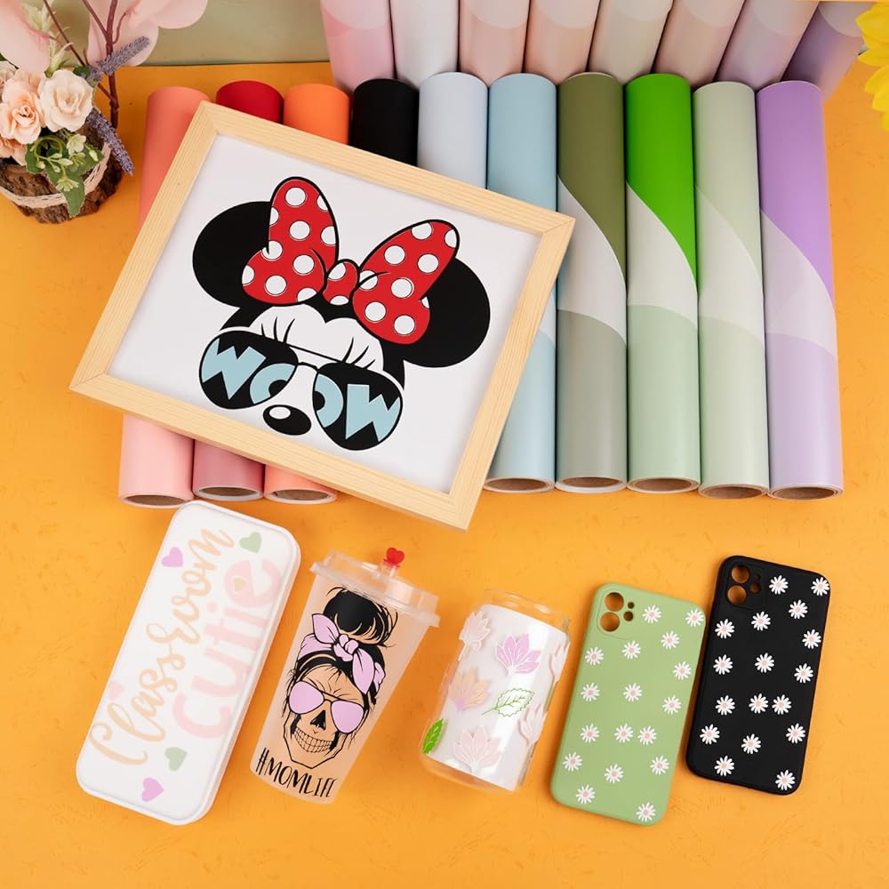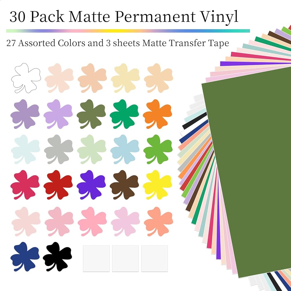 حزمة فينيل لاصقة من الفينيل - 30 ورقة مقاس 30.48 سم × 30.48 سم من الفينيل الدائم غير اللامع 27 عبوة من الفينيل اللاصق بألوان متنوعة لملصق السيارة، ملصق ديكور (مع 3 ورق نقل)