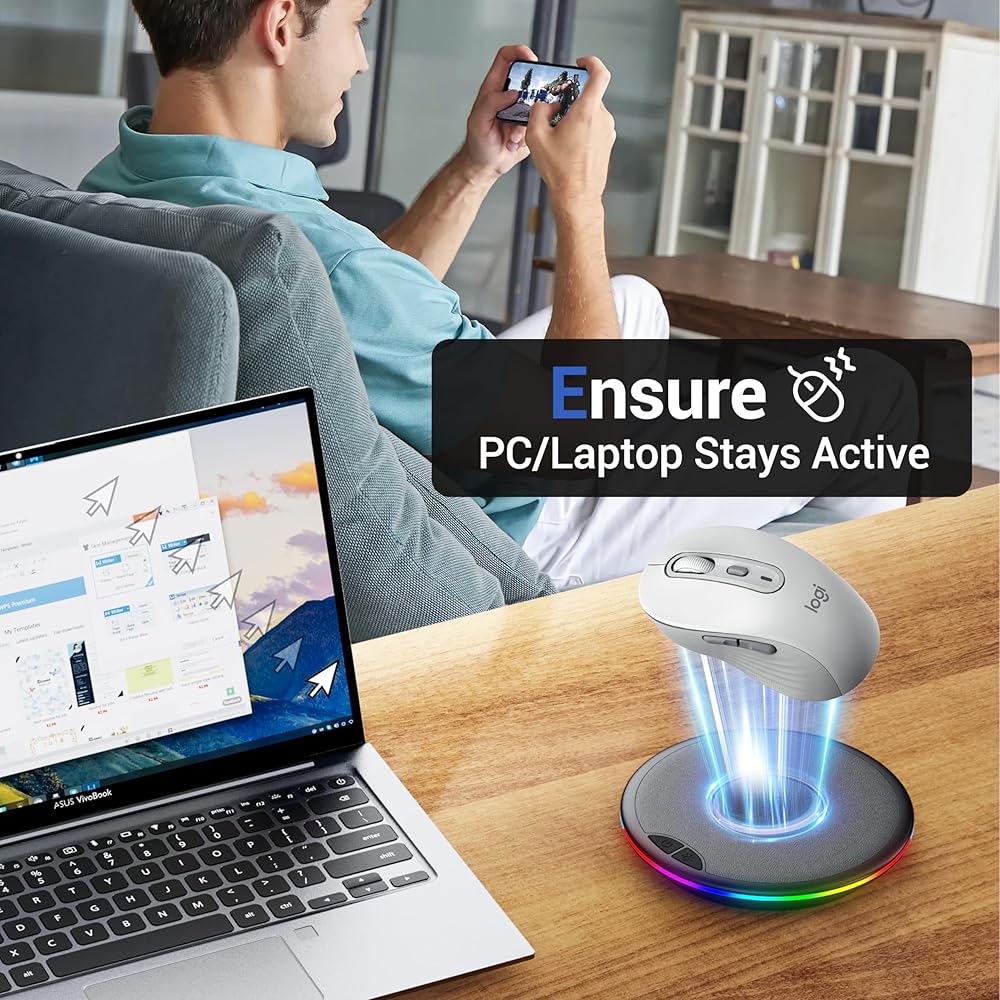 ULTRA-THIN DESIGN: This mouse mover device measures 5.2*5.2*0.7 inches, making it 50% thinner compared to similar products measuring 6.3*6.3*1.5 inches. This means you can greatly save desktop space and conveniently carry it with you on the go
