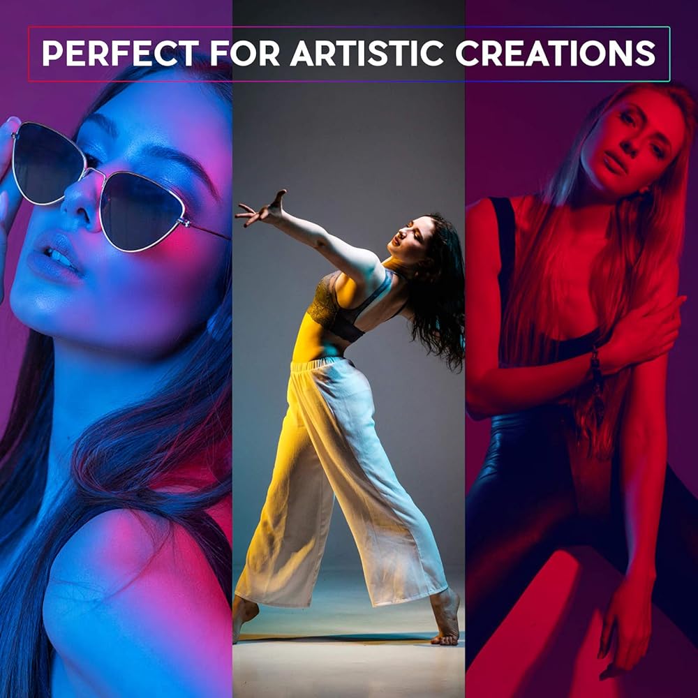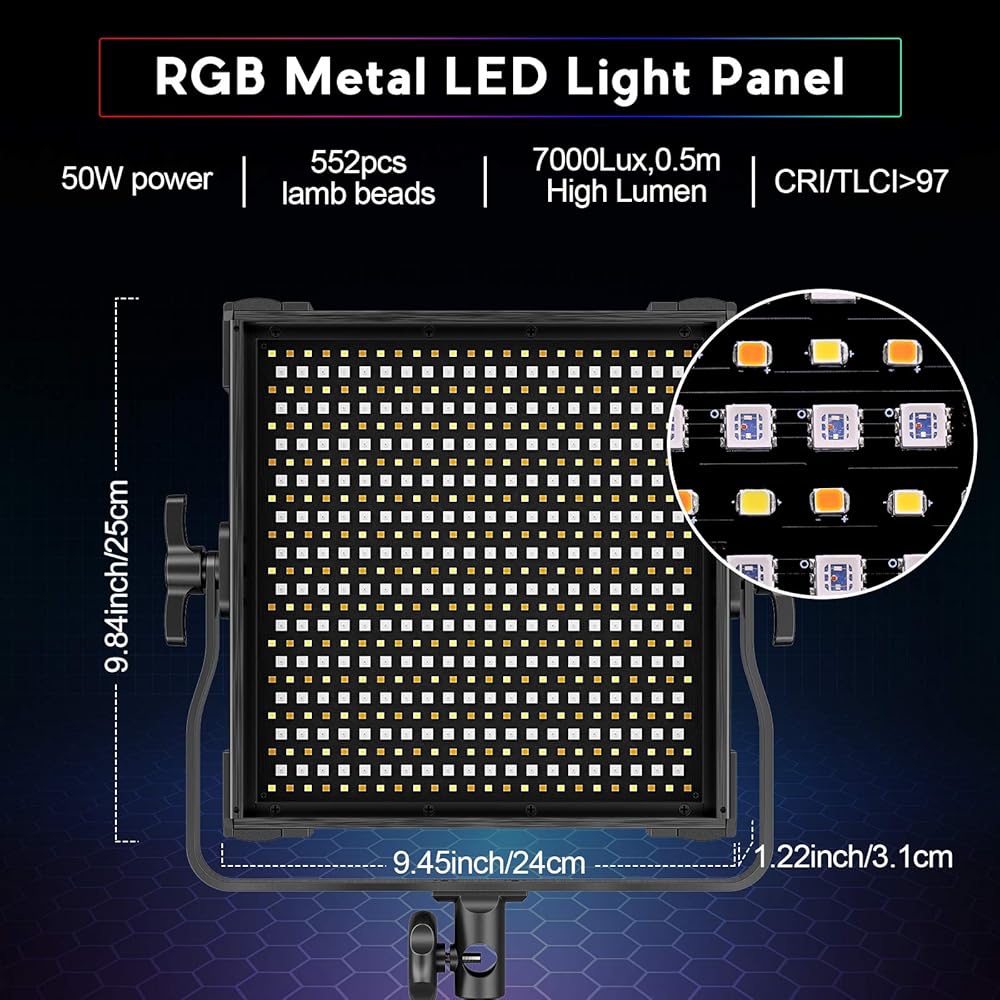 【إضاءة فيديو LED RGB 】طاقة 50 وات، 552 قطعة خرز SMD LED، 312 قطعة (أبيض/أصفر) و240 قطعة RGB. مؤشر تجسيد الألوان العالي CRI>97، TLCI>97، درجة حرارة لون واسعة 2600K-10000K، سلسلة ألوان كاملة 360 درجة وتعتيم بدون خطوات 0%-100%، مما يوفر إضاءة رائعة ويجعل التصوير الفوتوغرافي الخاص بك أكثر ألوانًا.