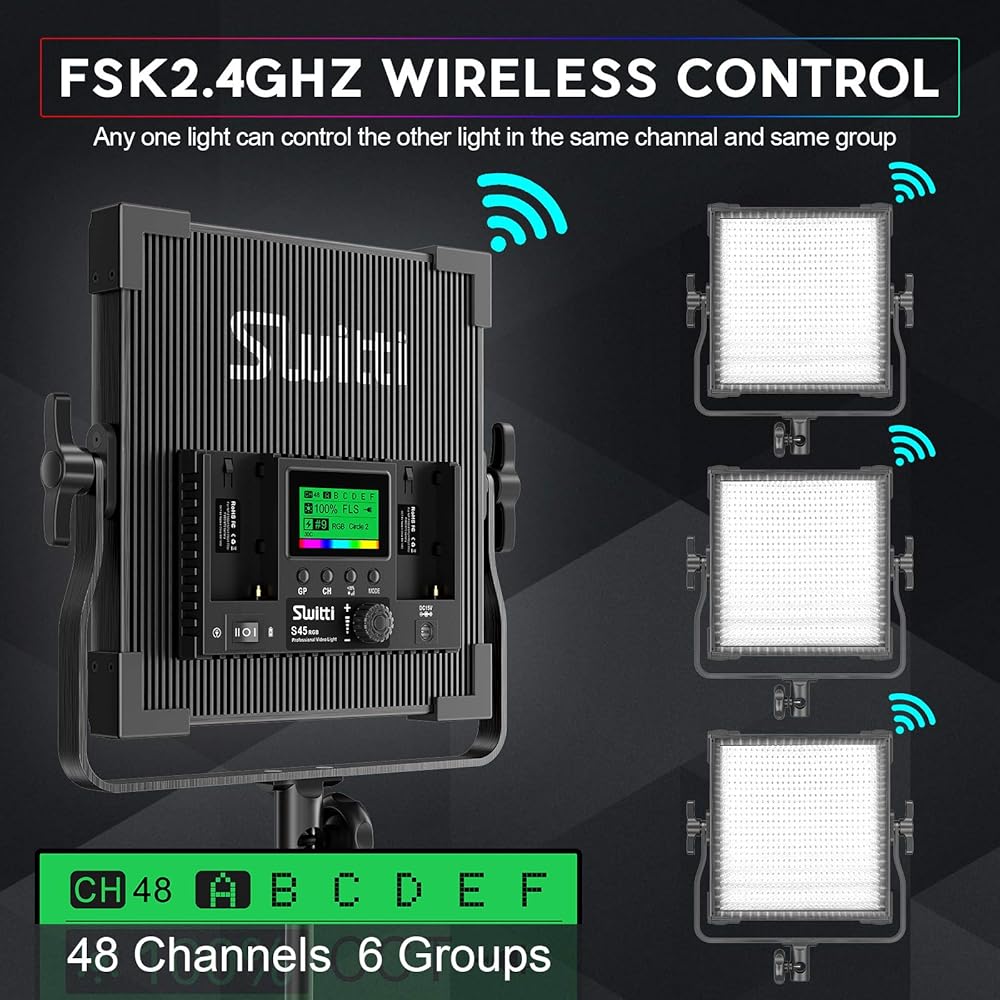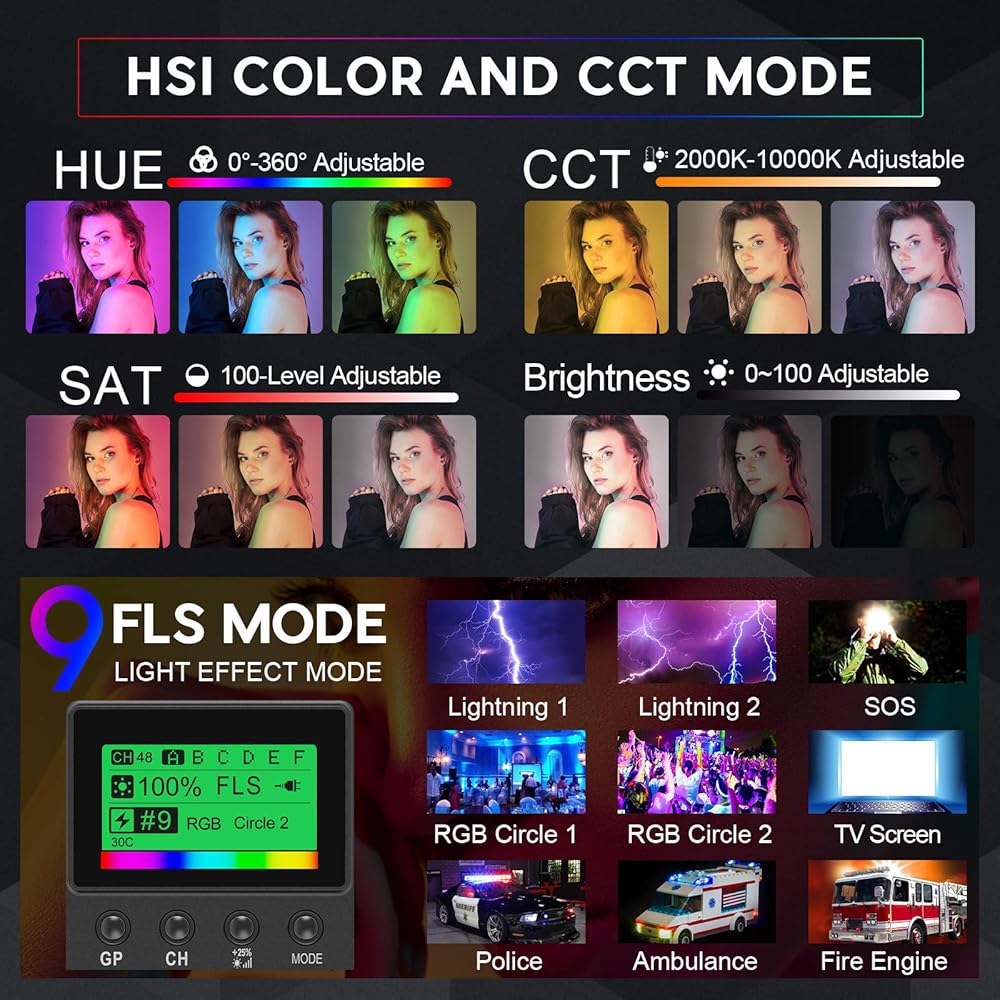 【أوضاع المشاهد المدمجة / التحكم في المجموعات والقنوات المتعددة 】يدعم ضوء التصوير الفوتوغرافي الخاص بنا 9 مشاهد إضاءة خاصة، مما يثري إبداعك في التصوير. 6 مجموعات و48 قناة، يمكنك ضبط وضبط درجة حرارة اللون والسطوع ومعلمات HSI والمشاهد بسهولة من خلال الزر والمقبض الموجود على اللوحة. المدمج في التحكم اللاسلكي FSK2.4 جيجا هرتز، يمكنك ضبط ضوء واحد كوضع رئيسي وأضواء أخرى كوضع تابع، ويمكنه التحكم بسهولة في جميع الأضواء باستخدام المصباح الرئيسي. (ملاحظة: في نفس المجموعة والقناة).
