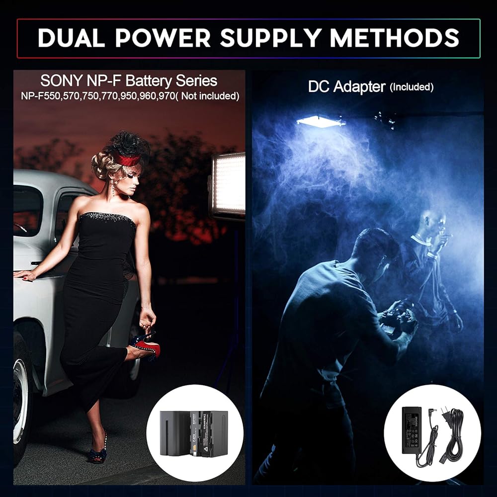 【خيارات إمداد الطاقة / البطارية بتيار مستمر】توفر لوحة الإضاءة مصدر طاقة مزدوج، أو محول تيار مستمر (متضمن) أو بطارية (غير متضمنة)، وهي مناسبة للتصوير الداخلي والخارجي. تستخدم هذه المجموعة بشكل مثالي في التصوير الفوتوغرافي للصور/المنتج، والمقابلات، والأفلام. الإضاءة، والبث المباشر، وتصوير الفيديو، والألعاب المباشرة، وTwitch، وفيديو YouTube، وفيديو TikTok، وما إلى ذلك