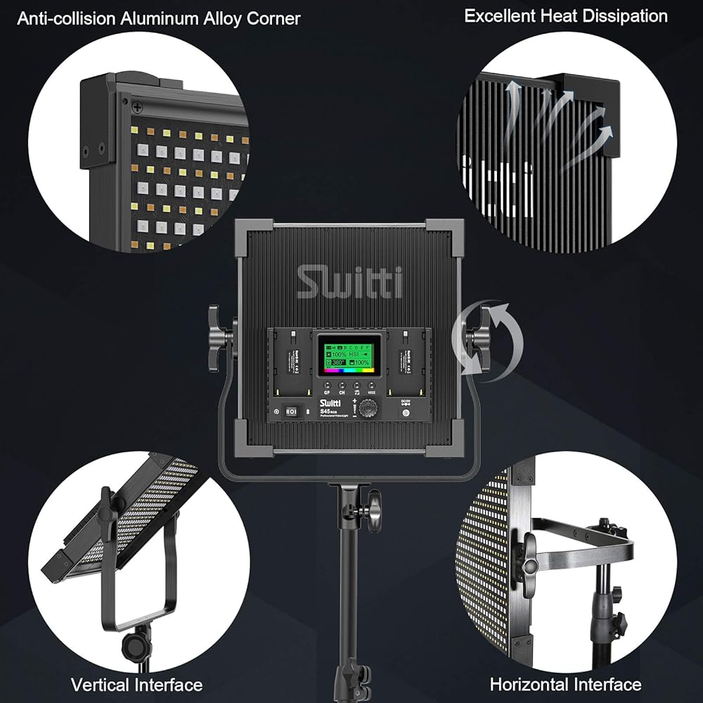 【هيكل معدني】مصباح فيديو التصوير الفوتوغرافي مصنوع من سبائك الألومنيوم عالية الجودة مما يظهر مظهرًا أنيقًا بسيطًا وتبديدًا ممتازًا للحرارة؛ يتيح حامل التثبيت على شكل حرف U للمصورين إمكانية ضبط زاوية الإضاءة وفقًا لبيئة التصوير.