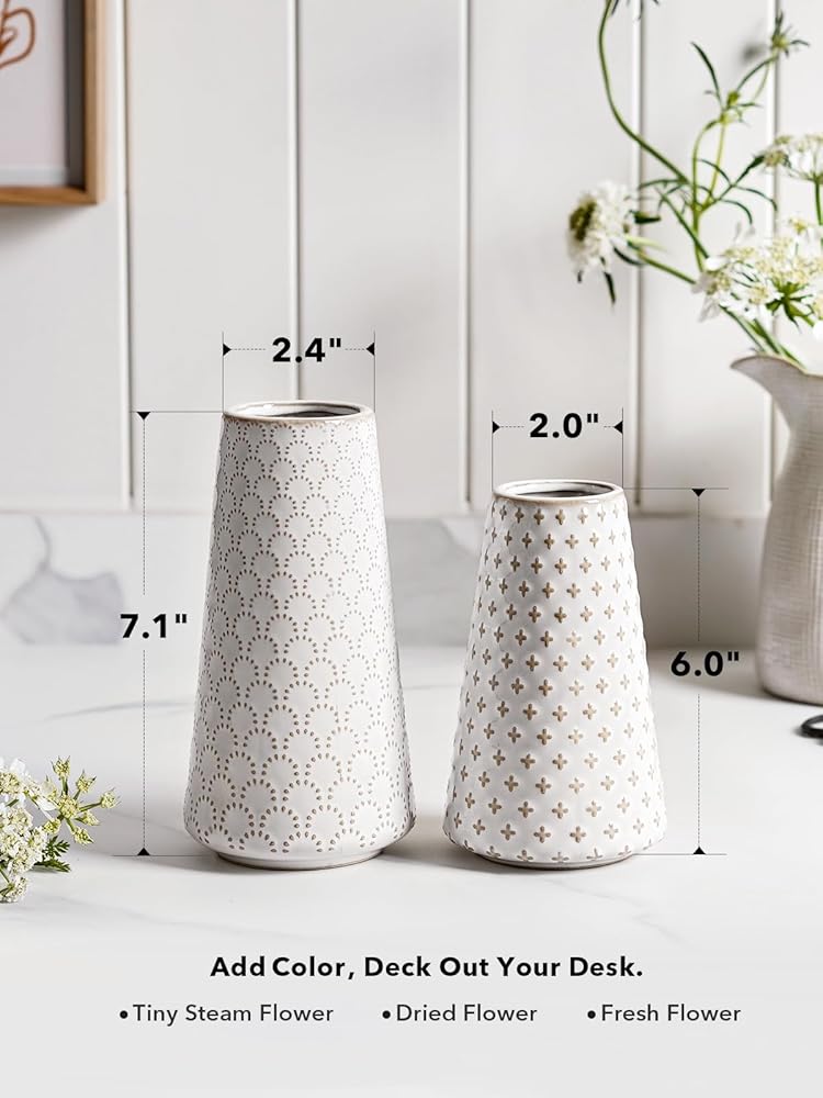 مناسبات متعددة الاستخدام: تعتبر هذه المزهريات الخزفية البيضاء ذات التصميم المنقوش للديكور قطعة مركزية رائعة لجميع الغرف والمناسبات بفضل تصميمها الأنيق والطبيعي. مناسب للاستخدام اليومي في الموقد والحمام وغرفة النوم وغرفة الغسيل وغرفة المعيشة. ولكن يمكن أيضًا أن تكون ديكورًا في قطع مركزية للطاولة لحفلات الزفاف أو التخرج أو الحفلات أو المطاعم.