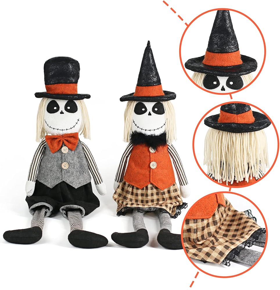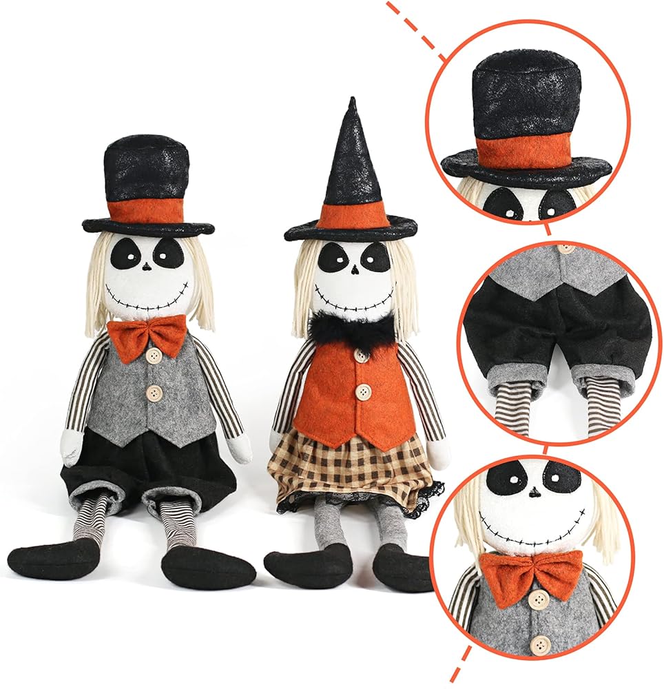 【دمية الهيكل العظمي للسيد والسيدة الهالوين】دمية الهيكل العظمي المصنوعة يدويًا هي الديكورات الأساسية لإضاءة الهالوين هذا العام. الشعر الأبيض والقبعة السوداء والزي الرائع وربطة العنق والوجه المبتسم المخيف! الصنعة ستجعل منزلك أكثر جاذبية.