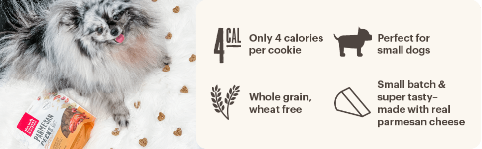 LOW CALORIE TRAINING TREAT: Our Parmesan Pecks are only 4 calories per cookie and can easily be snapped in half for more calorie control or for smaller mouths.