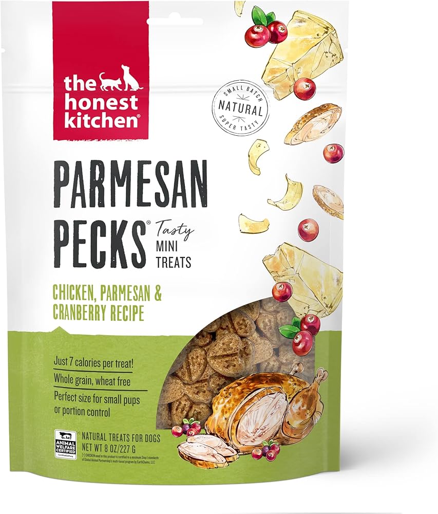 The Honest Kitchen believes that good dogs shouldn't settle for boring biscuits! That's why our Parmesan Pecks combine mouthwatering free range chicken and real cheese (yes, please!) into one little bite. They're easy to snap for portion control or for smaller dogs. Each delicious mini heart is packed with flavor, but not with calories, to create a craveable snack without compromise.