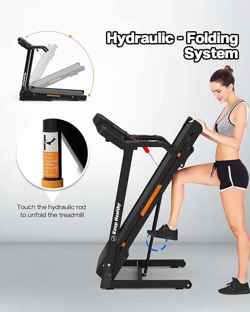 Space-Efficient with Easy Storage: Designed with a hydraulic lever for easy folding and storage, this compact treadmill is perfect for small spaces, featuring transport wheels for effortless mobility. It includes two cup holders and a pad holder, enhancing your workout convenience and hydration.