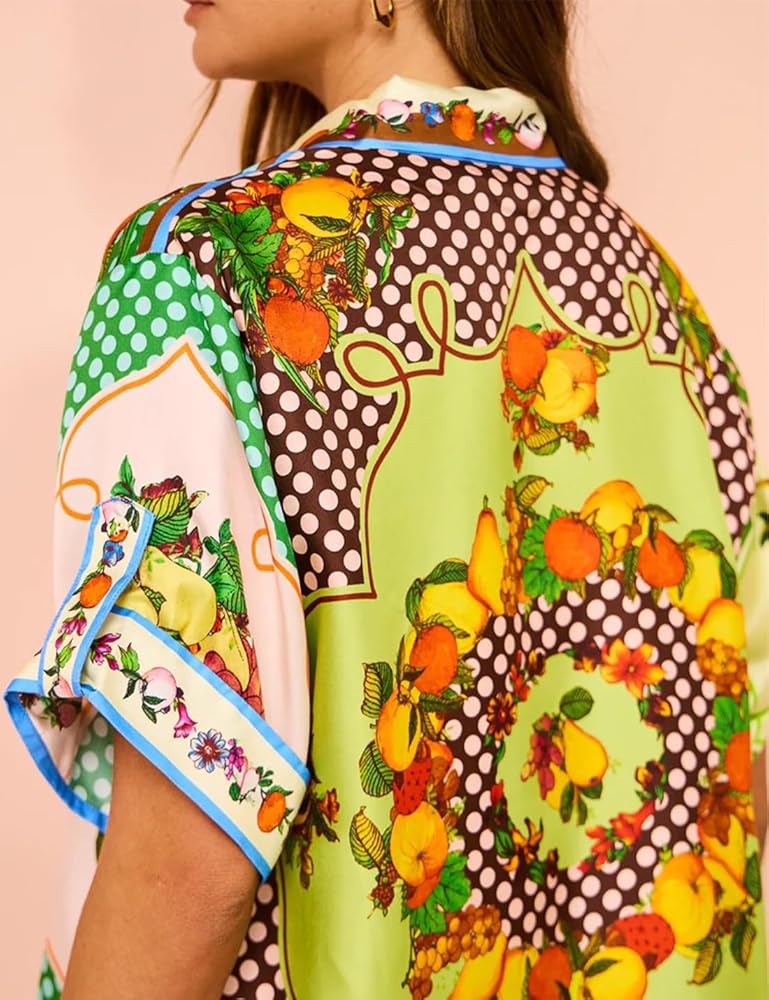 • القمصان العلوية: قمصان علوية نسائية بأكمام ملفوفة، ياقة مطوية على شكل طية صدر، 3/4 أكمام قصيرة، أزرار، مقاس مريح، كتف منسدل، حاشية منحنية، طباعة فريدة، مليئة بالشخصية، قمصان علوية نسائية بنمط Y2K