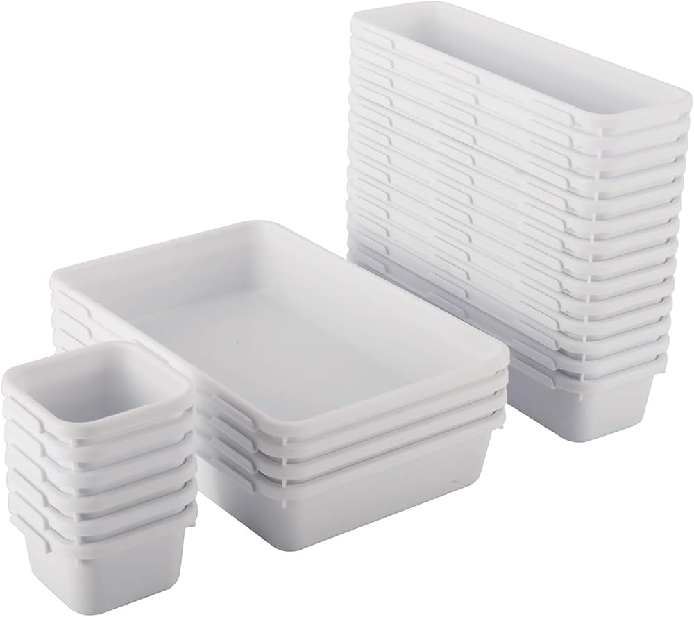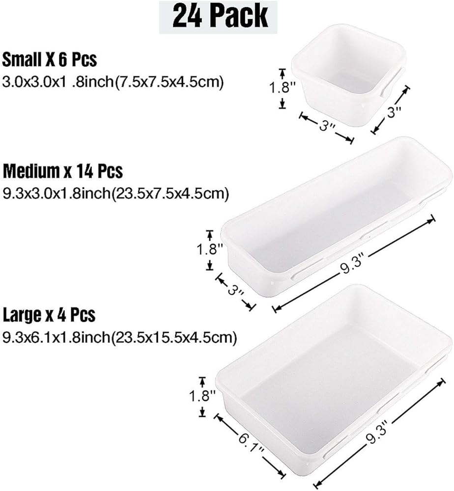 ما ستحصل عليه - مجموعة مكونة من 24 قطعة تتضمن 4 صواني صناديق كبيرة مقاس كل منها 9.3 × 6.1 × 1.8 بوصة، و14 صندوقًا متوسطًا 9.3 × 3.0 × 1.8 بوصة، و6 صناديق صغيرة مقاس 3.0 × 3.0 × 1.8 بوصة.