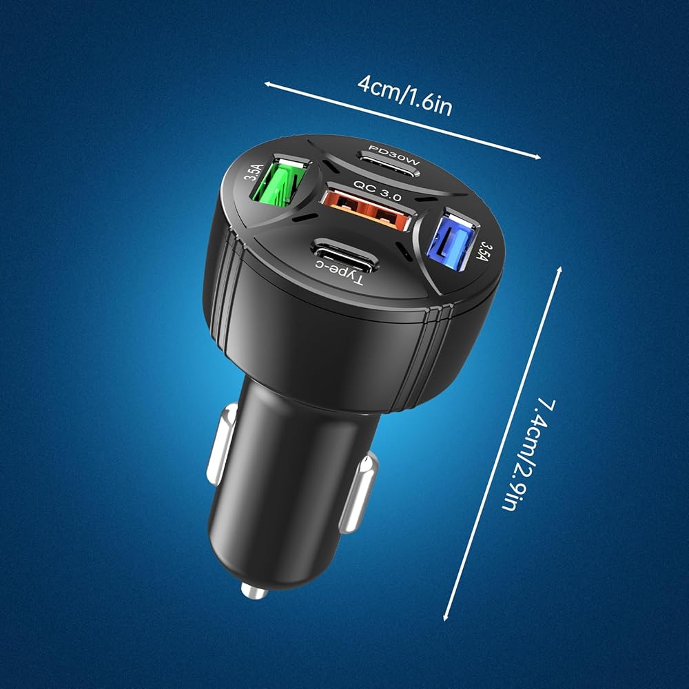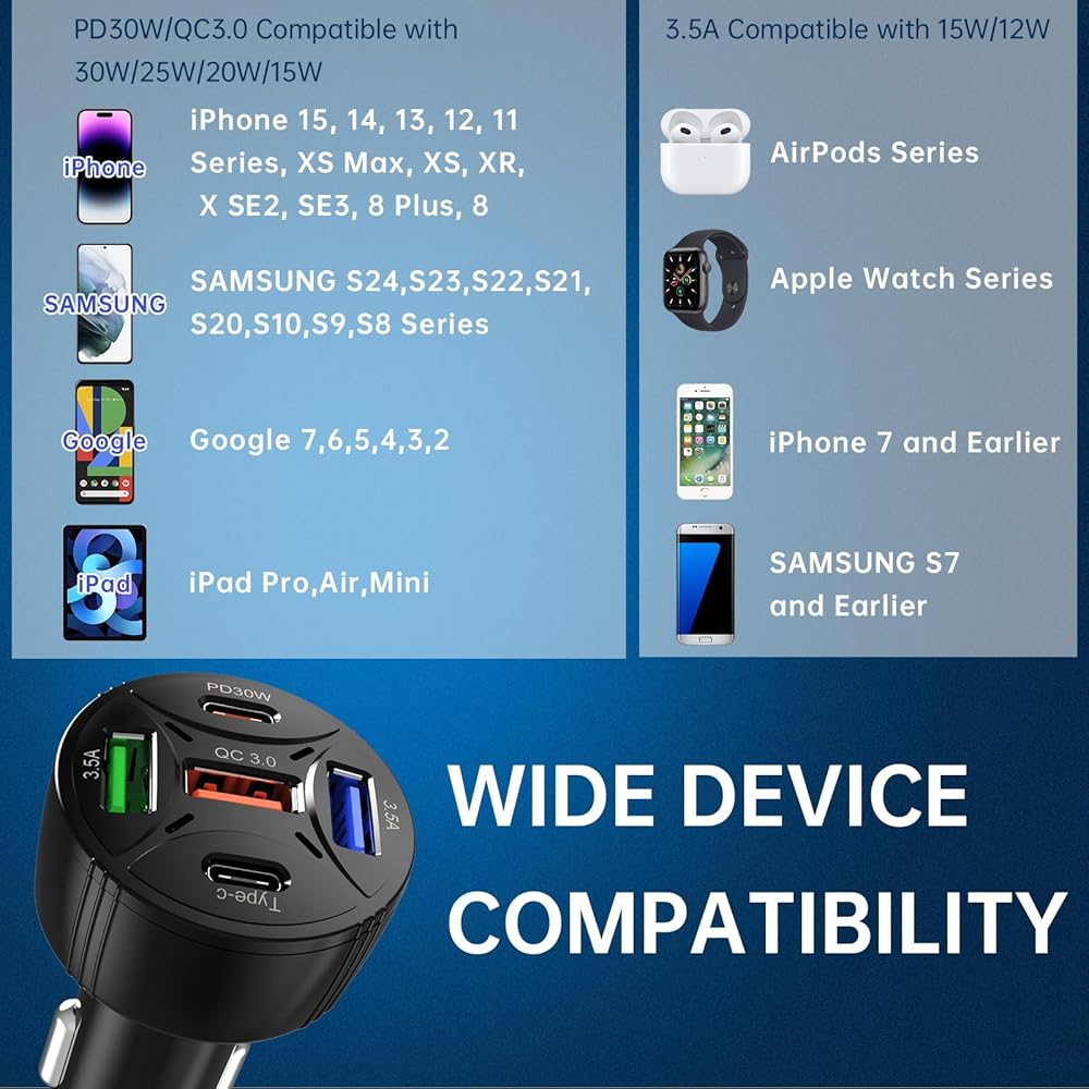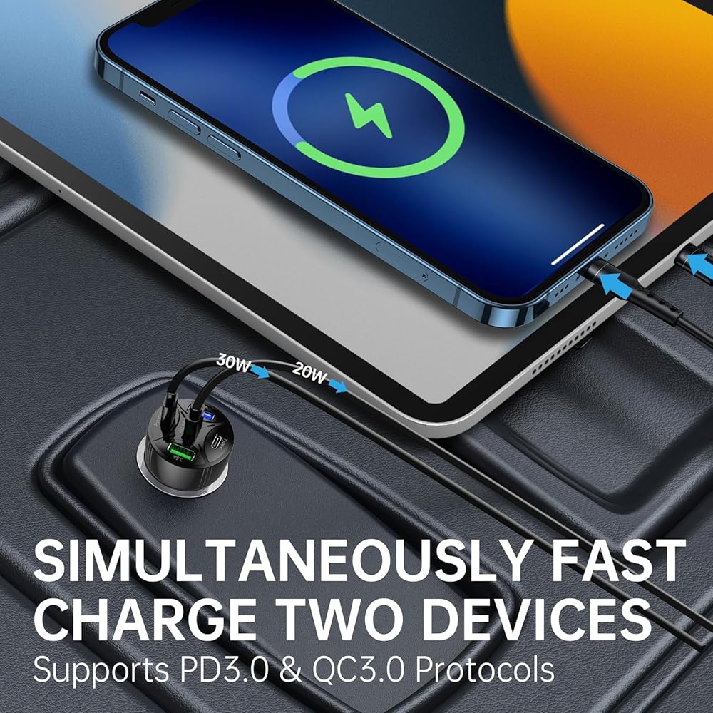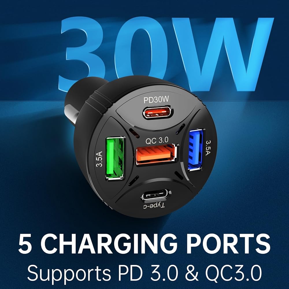 🔋【Powerful Charging】Our 65W Total 5-Port USB C Car Charger with PD 30W and QC 3.0 capabilities can rapidly charge a wide range of devices, including smartphones like iPhone and Samsung Galaxy, as well as other mobile electronics such as MacBook laptops and tablets.