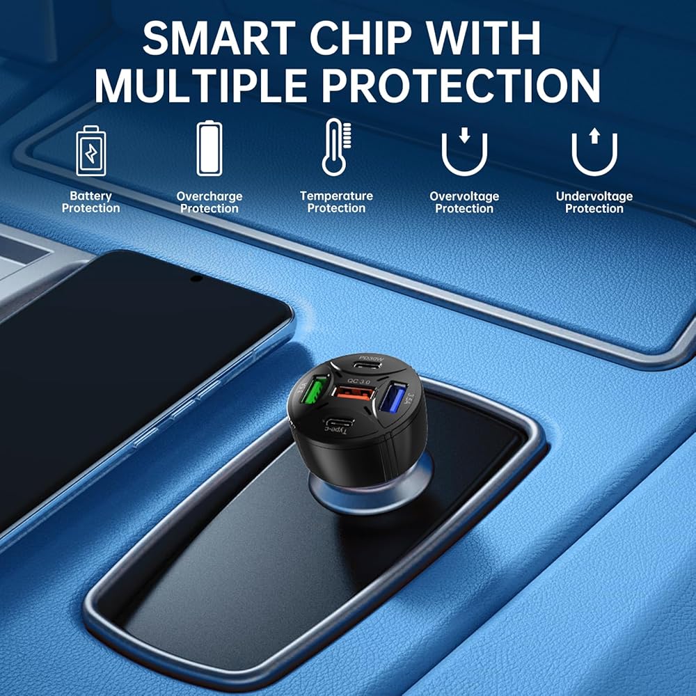 👍【Certified Safety】This multi-port car charger, certified by CE, FCC, and RoHS, features an internal IC chip that safeguards your devices against excessive current, overheating, overvoltage, and overload. Charging automatically stops when the battery is full. Crafted from ABS+PC fire-resistant material, it ensures safety and reliability during use, enhancing its lifespan.