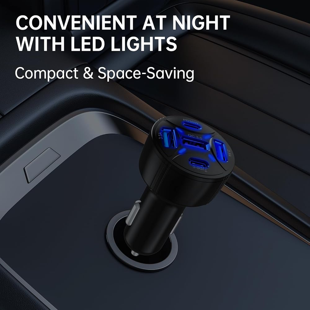 👏【5-in-1 Ports】Featuring 2 USB C ports and 3 USB A ports, this car adapter plug socket is an ideal companion for family trips and outings with children. The lighter charger, equipped with the latest intelligent chip technology, charges each of your devices at optimal speed, ensuring maximum charging efficiency even when powering multiple devices simultaneously.