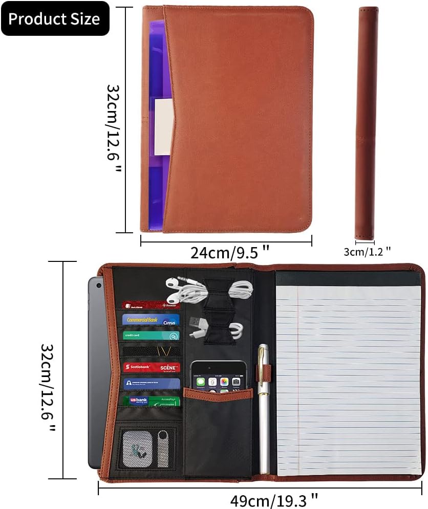 Innovative Design:This leather business porfolio features 3 big pockets for documents ,pad ,notebook,6 card slots,phone pouch,2 mesh pocket USB stick,pen holder
