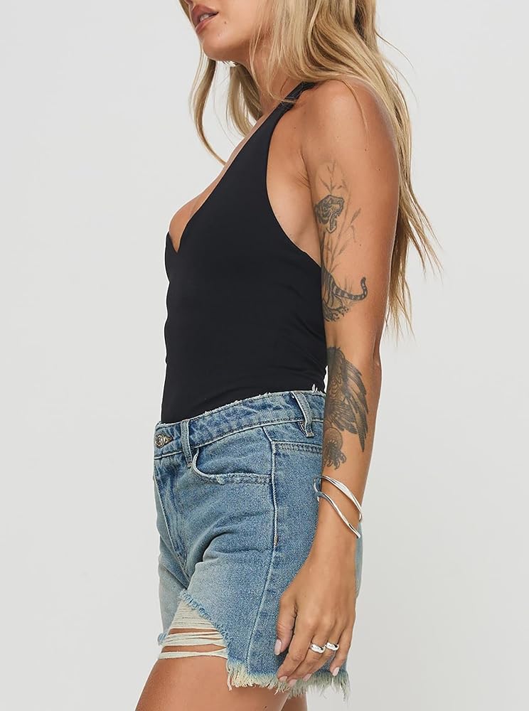 Features - Halter tank top bodysuit, v neck bodysuits, double lined design, backless body suits for women