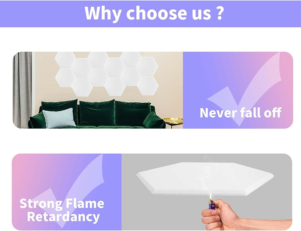 • 【High-Density Eco-Friendly】Our hexagonal soundproof wall panels made of high-density polyester are safe, odourless, lightweight and have excellent soundproof treatment for noise reduction.