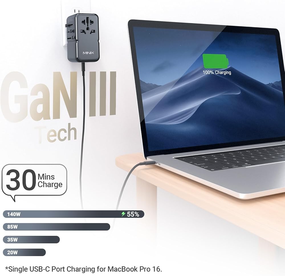MINIXTP140 GaN lll Universal Travel Adapter can be used in more than 180 countries and regions - bringing it with your trip and never be out of power. This universal travel adapter would allow you to connect to any local power socket around the world and rapidly recharge your power-hungry devices such as laptop, smartphone, tablet, camera, power bank, and more via its USB-C and USB-A ports. Just push the sliders on the side to reveal the three most common international plugs-US, EU and UK, plus the rotatable pins for Australian and China power sockets. The world input outlet of this travel adapter is compatible with most electronic devices of up to 2500W @250V/1000W @100V. Works with: Laptop, Tablet, Smartphone, Portable Game, Headsets, Power Bank, Console, Camera, Travel Hair, Electric Fan, Travel lron, Table Lamp ,Razor ,Dryer Specifications Model:TP140 Rating:100-250V10A Max,2500W MaxInput: 100-250V,50/60Hz,3.5A Single Port Output Mode USB-C1/C2:5.0V=3.0A 15.0W,9.0V-3.0A 27.0W12.0V=3.0A 36.0W,15.0V-3.0A 45.0W20.0V=5.0A100.0W,28.0V=5.0A 140.0W USB-C3/A1:5.0V=2.4A12.0W,9.0V=2.0A 18.0W 12.0V=1.5A 18.0W Combined Output Mode USB-C1+C2:PD100W+PD35W USB-C3+A1:5.0V=2.4A USB-C1/C2+C3/A1:100W+18W USB-C1+C2+C3/A1:PD65W+PD35W+18W USB-C1+C2+C3+A1:PD65W+PD35W+5.0V-2.4A Total Dc Output: 140WM/N: 659HF USA PLUG Slightly press and hold the USA/AUs button and slide upwards till the USA plug is fully extended and locked into position. Make sure the contact blades are turned to the parallel position. To hide the plug: Press and hold down the USA/AUS button to release and slide downwards until the plug is completely hidden back into the main unit. Use AUS Plug Slightly press and hold the USA/AUS button and slide upwards till the USA plug is fully extended and locked into position, Make sure the contact blades are twisted to the AUS position. To hide the plug: Press and hold down the USA/AUS button to release and slide downwards until the plug is completely hidden back into the main unit. Use UK Plug Slightly press the UK button and slide upwards till the UK plug is fully extended and locked into position. To hide the plug: Press and hold down the UK button to release and slide downwards until the plug is completely hidden back into the main unit. Use EU Plug Slightly press the EU button and slide upwards till the EU plug is fully extended and locked into position. To hide the plug: Press and hold down the EU button to release and slide downwards until the plug is completely hidden back into the main unit.