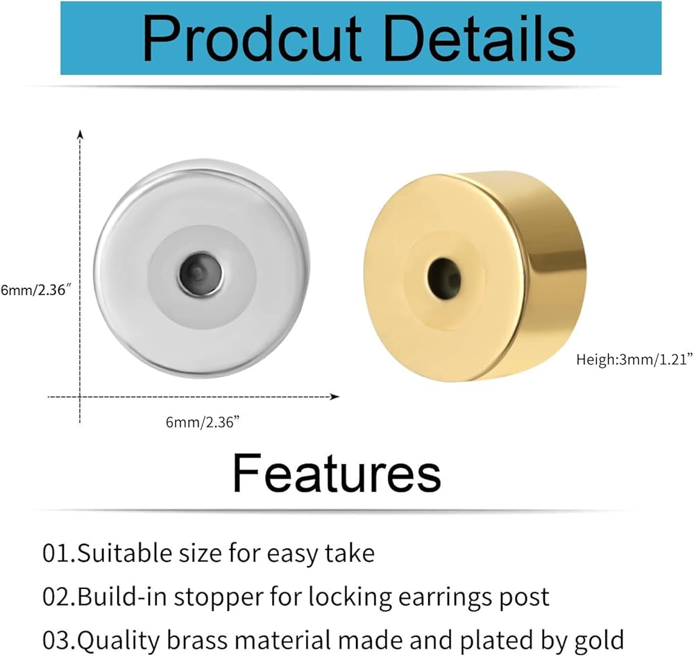 • تأتي الأقراط ذات القفل بمقاس قياسي 6 مم × 6 مم × 3 مم، مما يجعلها مناسبة تمامًا لأعمدة الأقراط التي يبلغ قياسها 0.031-0.042 بوصة. إنها خفيفة الوزن ومريحة، لذلك لن تلاحظ أنك ترتديها.