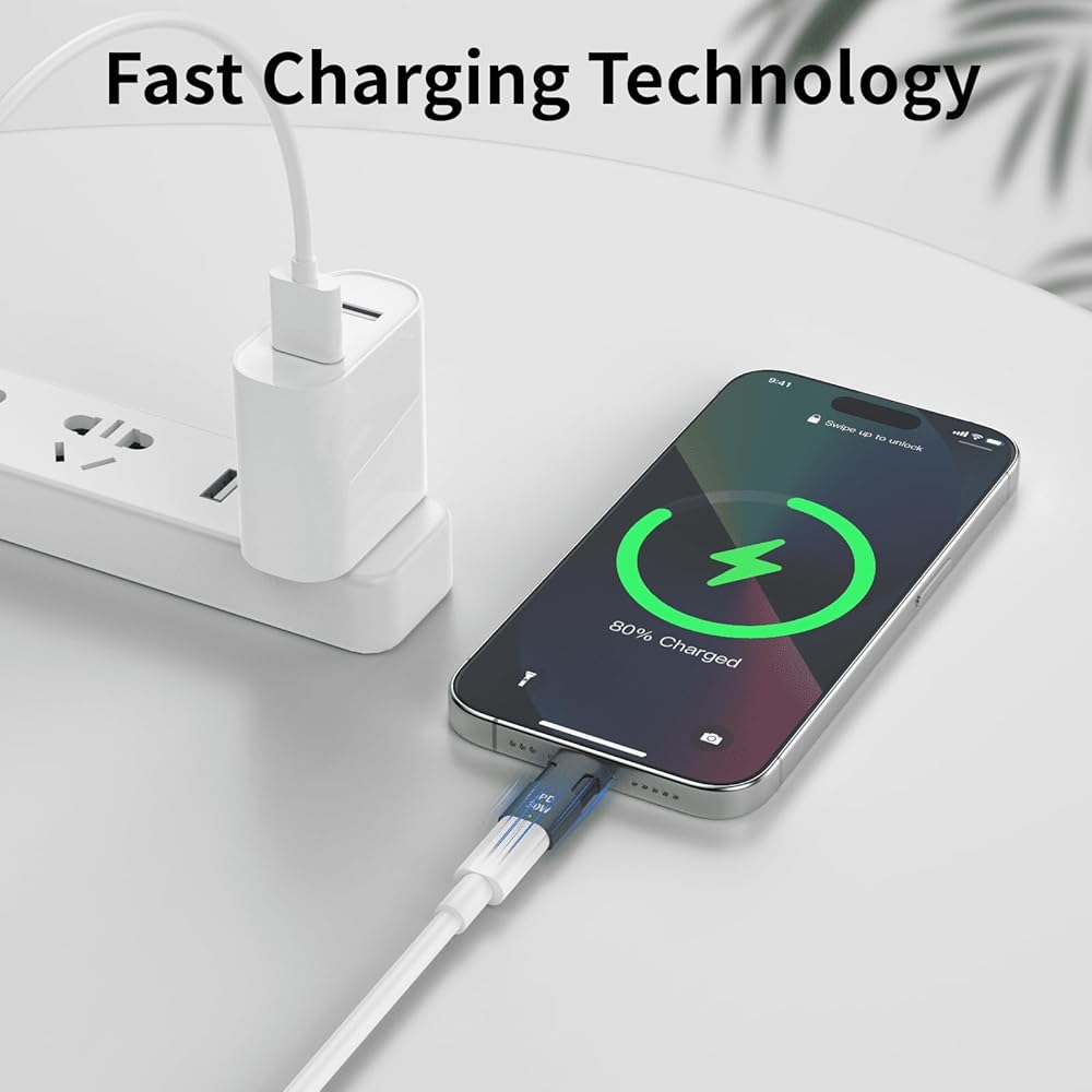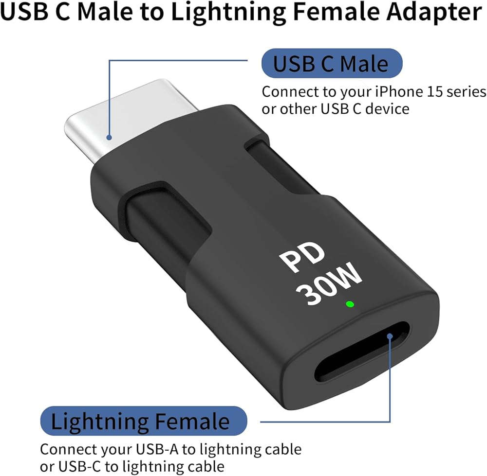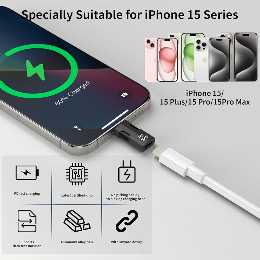 -This USB C to Lightning adapter supports 30W PD fast charging, saving you more time by fully charging your iPhone 15 series and other Type-C devices in no time.