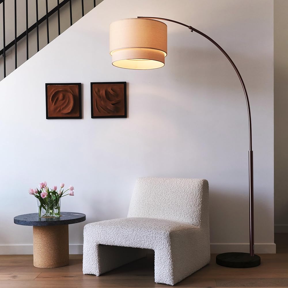 مصباح أرضي من Brightech Mason Arc - مصباح قائم على الزاوية الحديثة مع غطاء مصباح طبل معلق فريد لغرفة المعيشة - إضاءة علوية ساطعة، إضاءة معلقة منحنية لغرفة النوم. مكتبة دن - برونزية