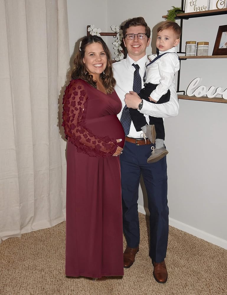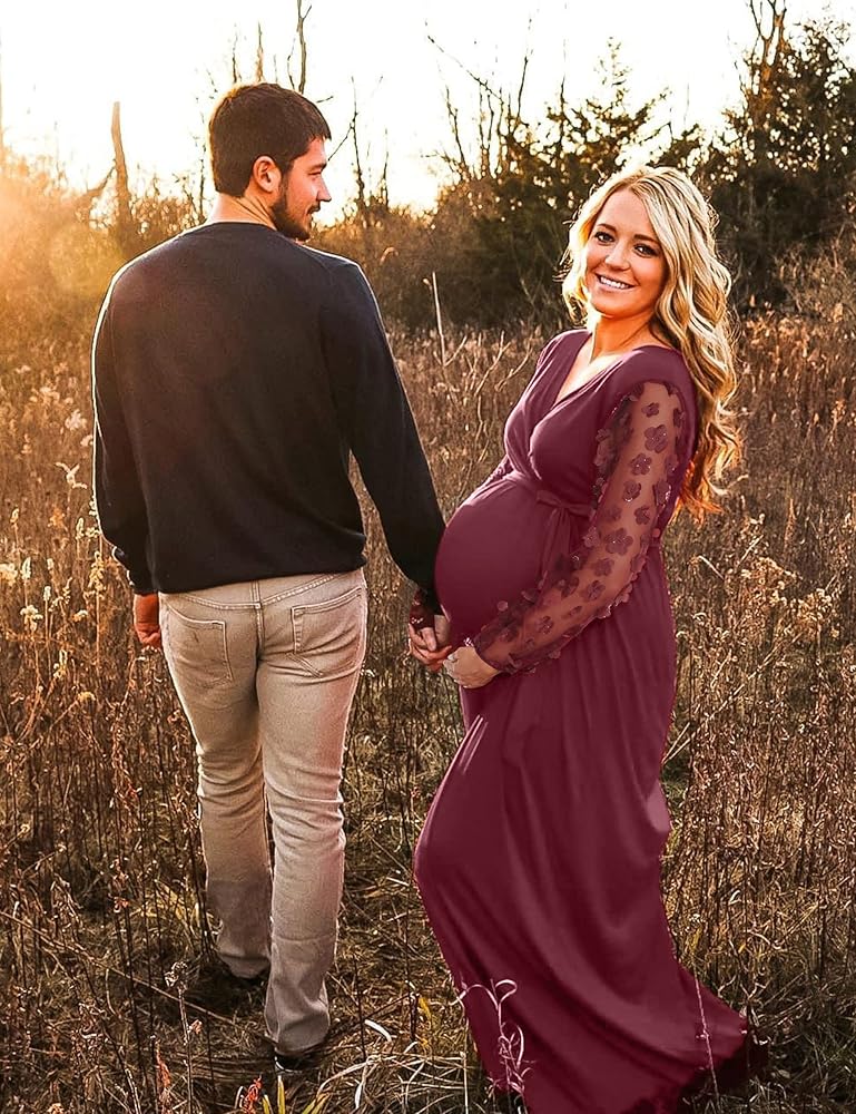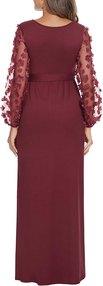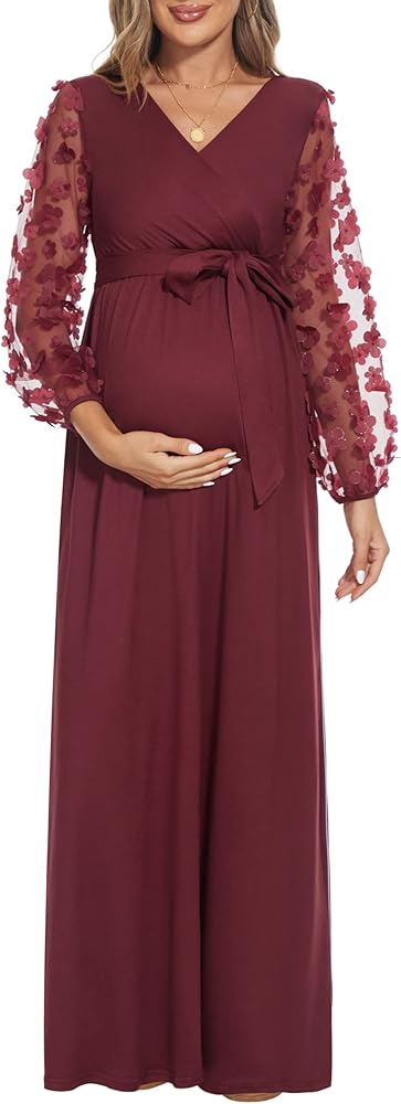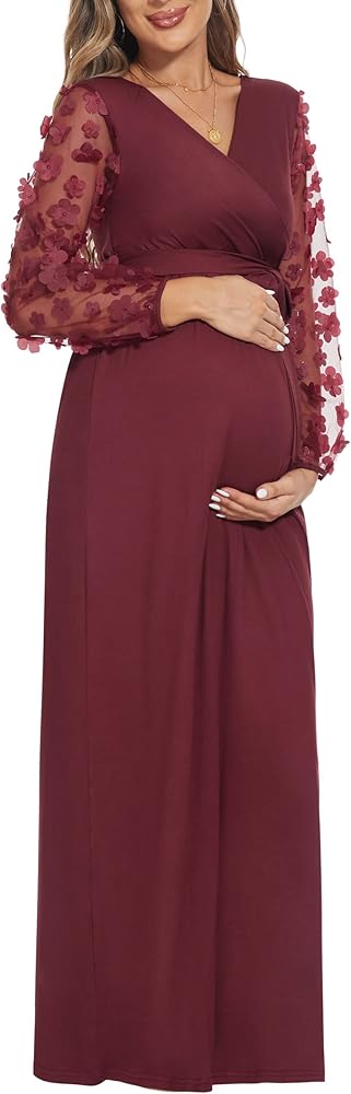 [كم من الدانتيل الزهري] فستان طويل للحمل بأكمام من الدانتيل مع حزام. رقبة على شكل حرف V، خيار الرضاعة الطبيعية سهل الوصول إليه. تصميم مكشكش مع وضع الراحة في الاعتبار لكل مرحلة من مراحل الحمل.