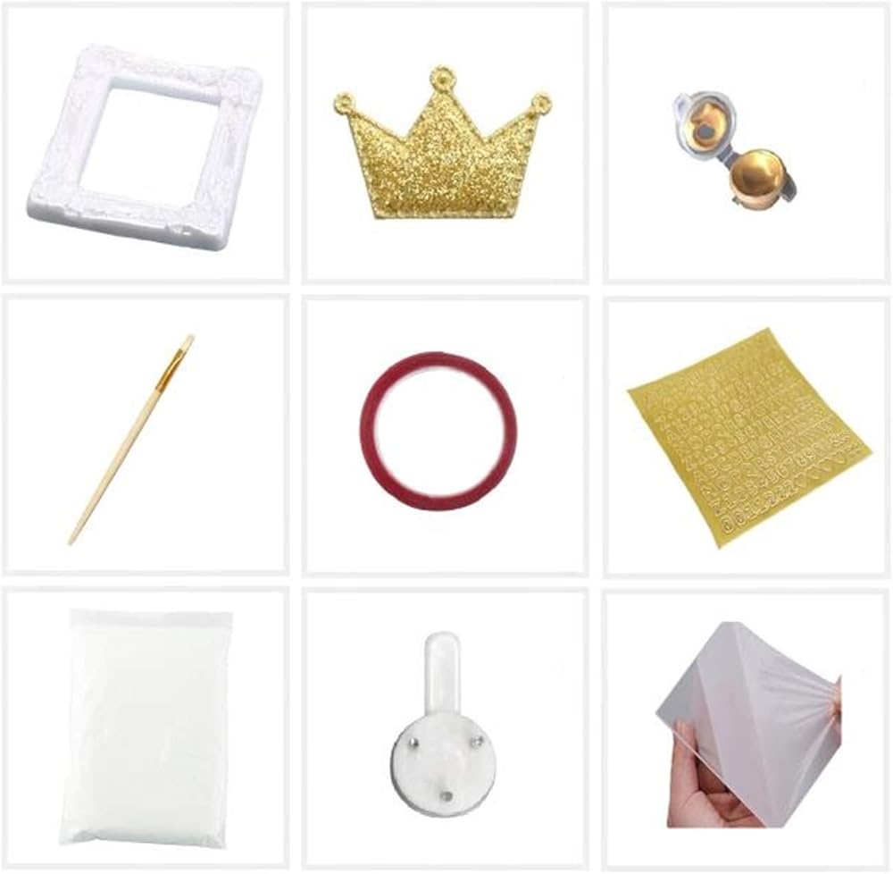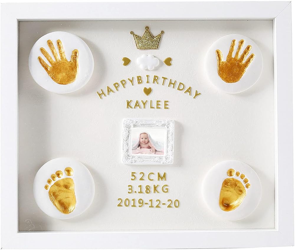 حزمة كاملة - كل الأشياء التي تحتاجها لصنع تذكار لبصمة اليد موجودة في الصندوق - بما في ذلك الإطار الصغير والملصقات والطلاء الذهبي وفرشاة الطلاء والغراء وما إلى ذلك.