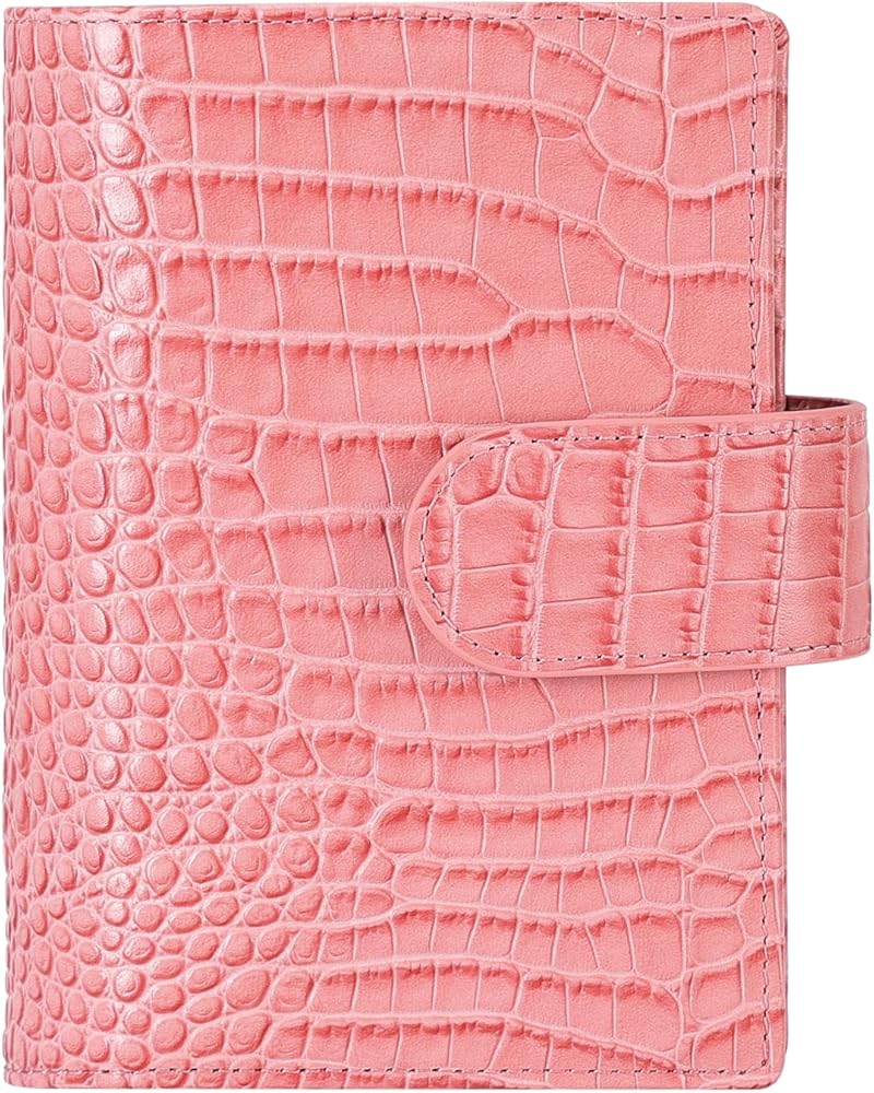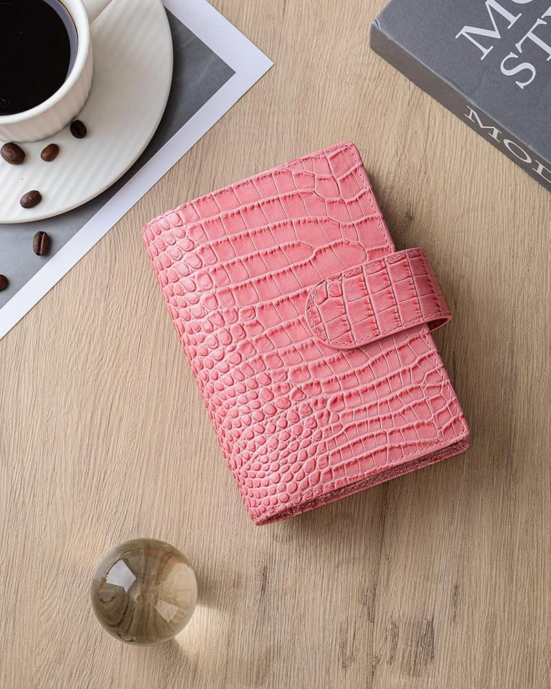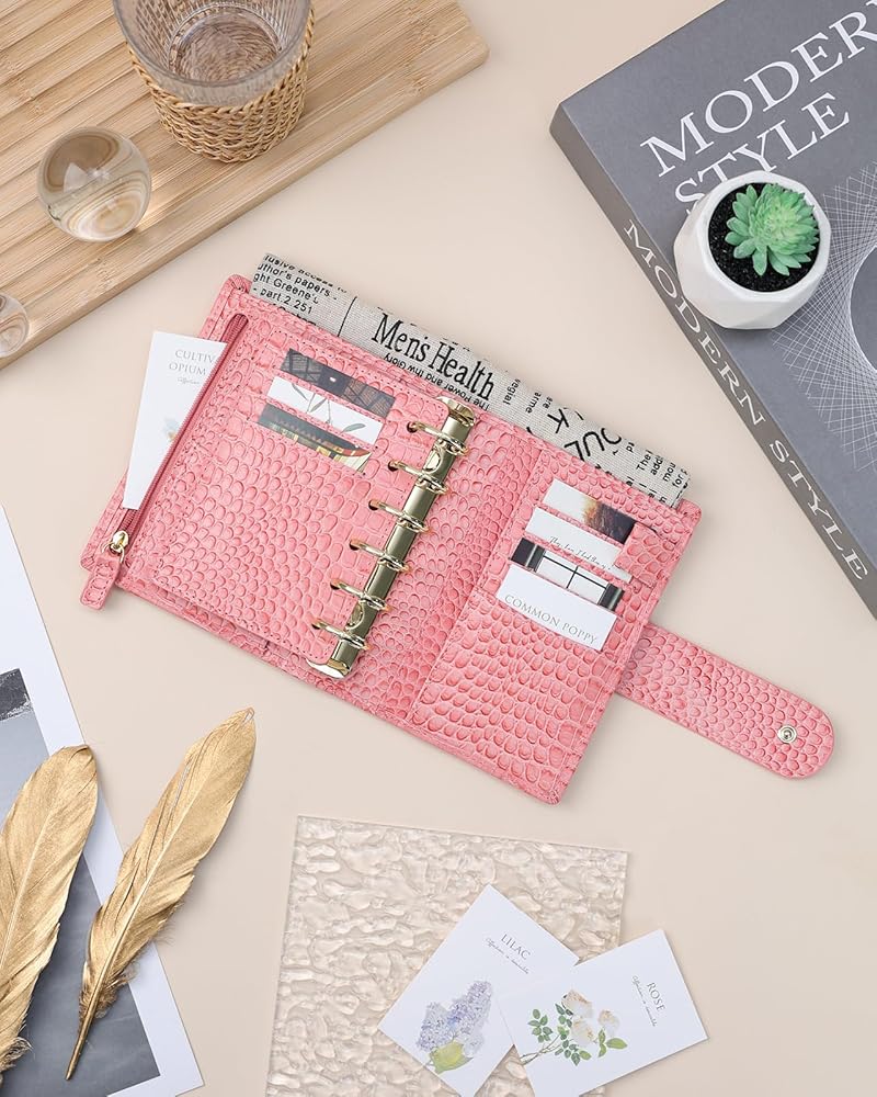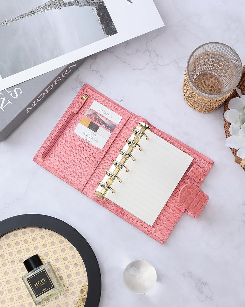 This leather organizer features a 6-ring binding system which can hold a hearty stack of A7 filler pages, with a long strap closure and double snap buttons to ensure maximum storage.