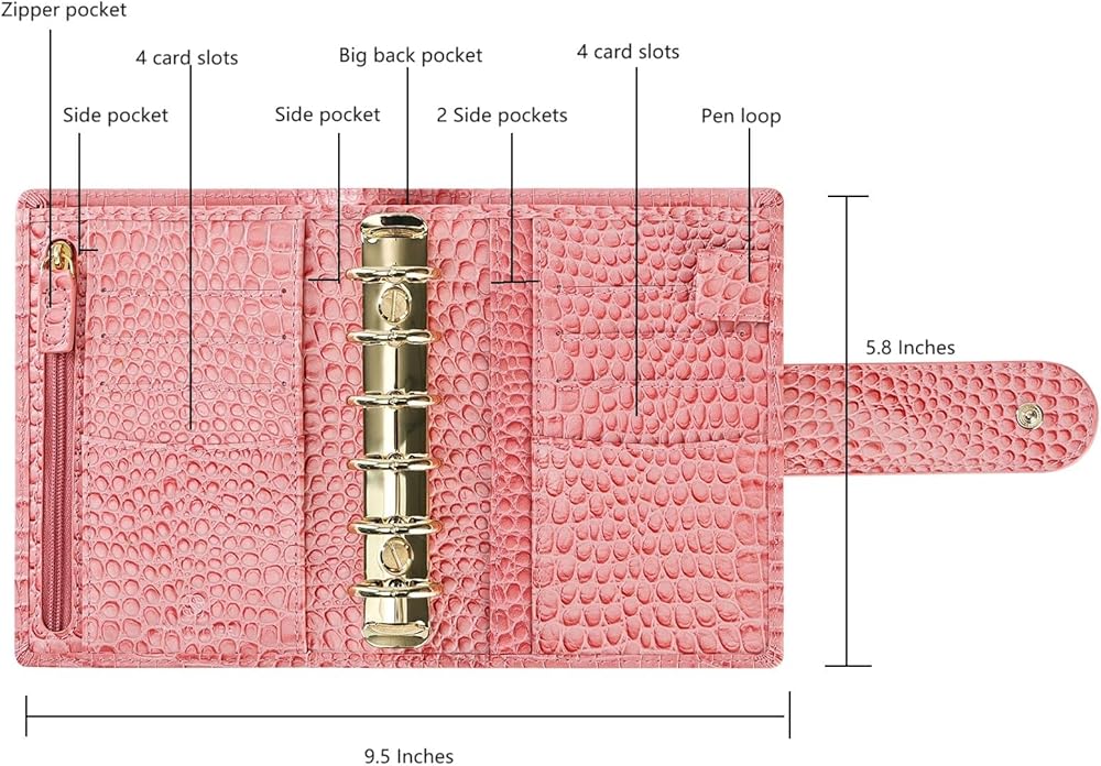 This leather notebook comes with a big back pocket to keep cash or receipts, a zippered coin pocket, a pen slot on the upper right, 4 side pockets and 8 card slots which can be used to store your credit or business cards, ID, note pad and more to maximize the binder's efficiency.