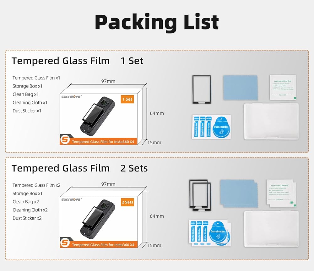 ✳️【Screen Protector for Insta 360 X4 】Specifically designed for Insta 360 X4, camera screen tempered film perfect fit for Insta360 X4 accessories, including 2 pieces of LCD screen protector, storage box *2, clean bag *2, cleaning cloth *2, dust sticker *2, total 2 set