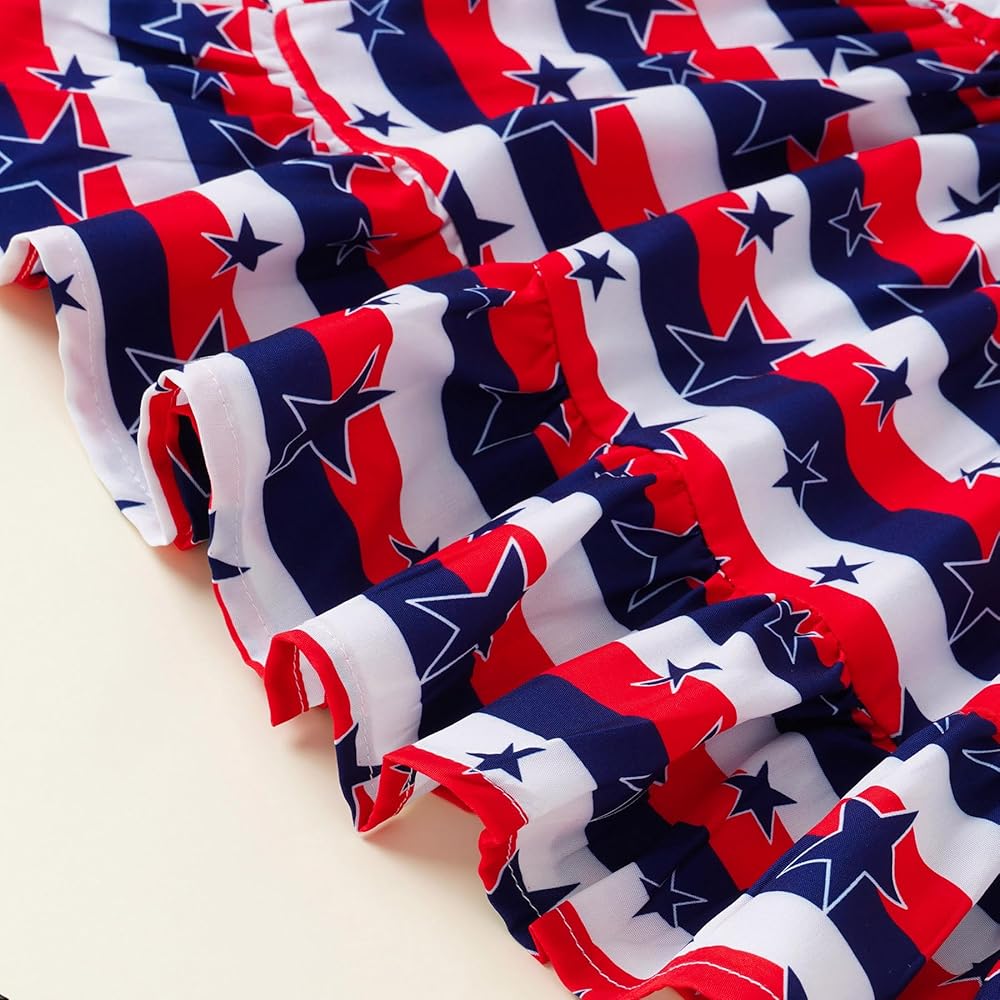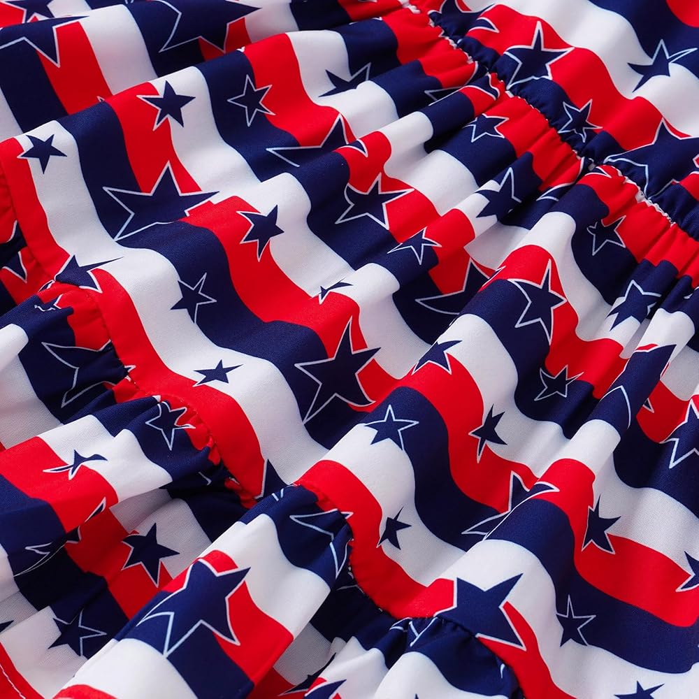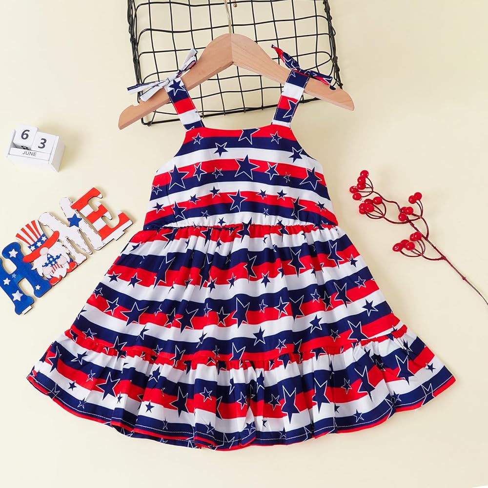 التصميم -- فستان بتصميم العلم الأمريكي، يوجد تصميمان لطيفان على شكل فيونكة صغيرة، فستان على شكل حرف A بحاشية مكشكشة، إنه أبيض وأحمر وأزرق ونجوم مخططة ومطبوعة على شكل نجوم فساتين وطنية للفتيات الصغيرات. مثالي للارتداء خلال عطلة الرابع من يوليو.