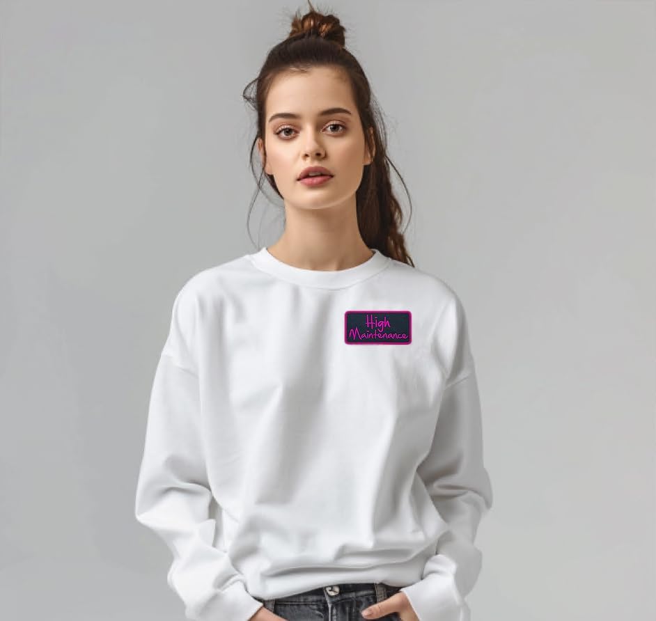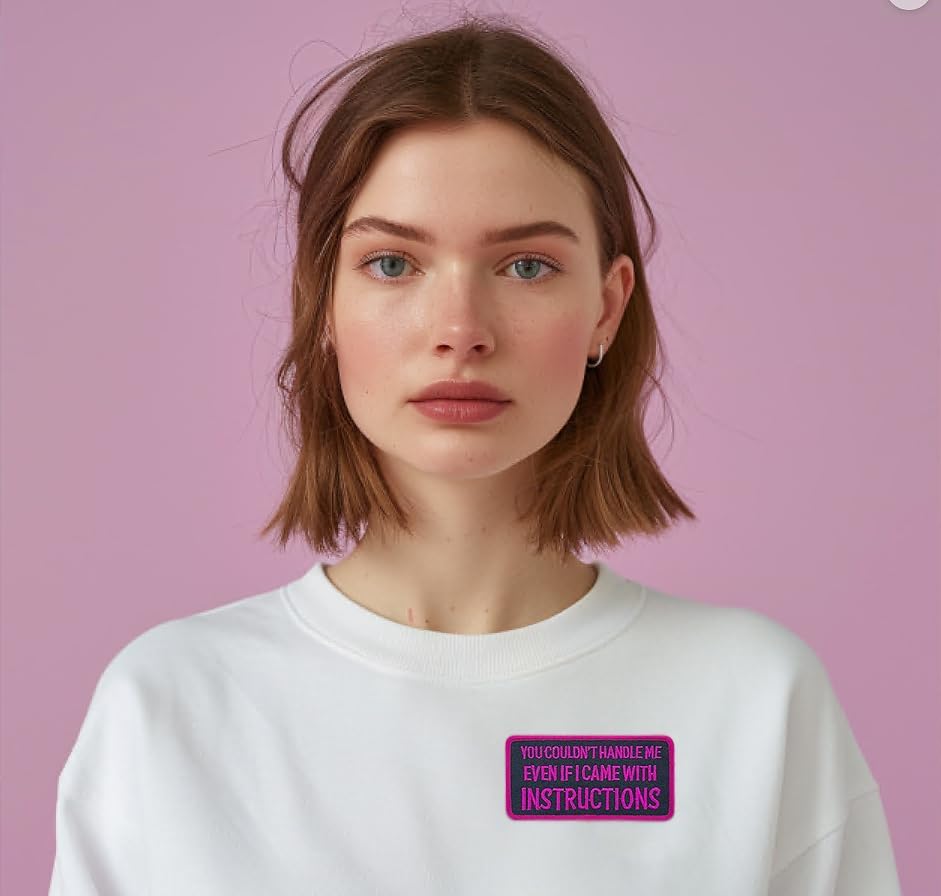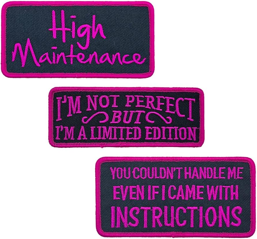 It contains 3 patches. One reads: High Maintenance. The other reads: I'm Not Perfect But I'm A Limited Edition. The third one reads: You couldn't handle me even if I came with instructions.