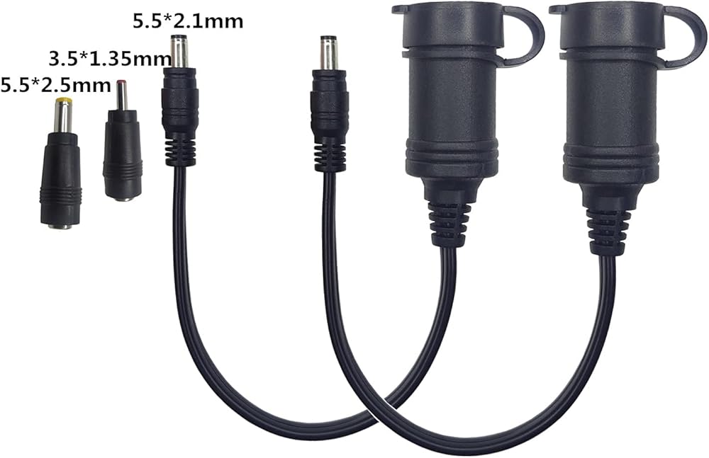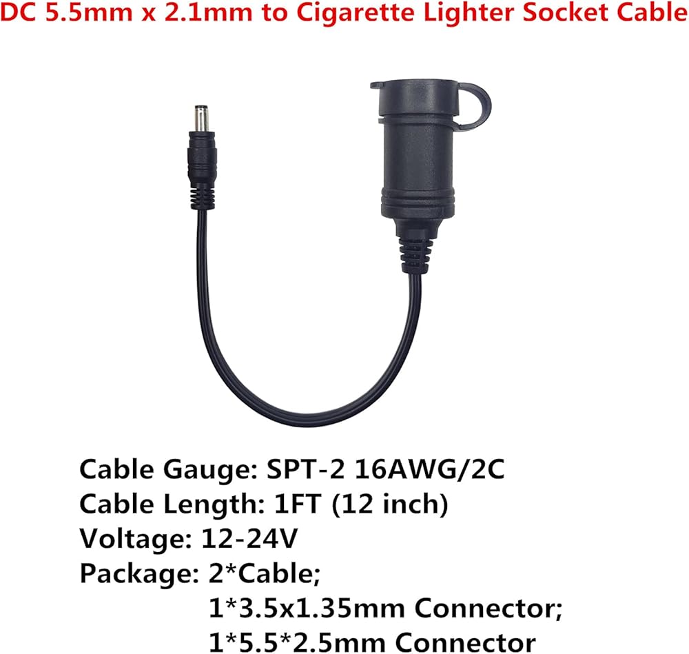 Cable Gauge: SPT-2 16AWG/2C; Cable Length: 1FT(12 inch); Voltage: 12-24V; Package: 1*DC 5.5mm x 2.1mm to Cigarette Lighter Female Socket Extension Cord, 1* dc 5.5*2.1 female to 5.5*2.5 male, 1* dc 5.5*2.1 female to 3.5*1.35 male.