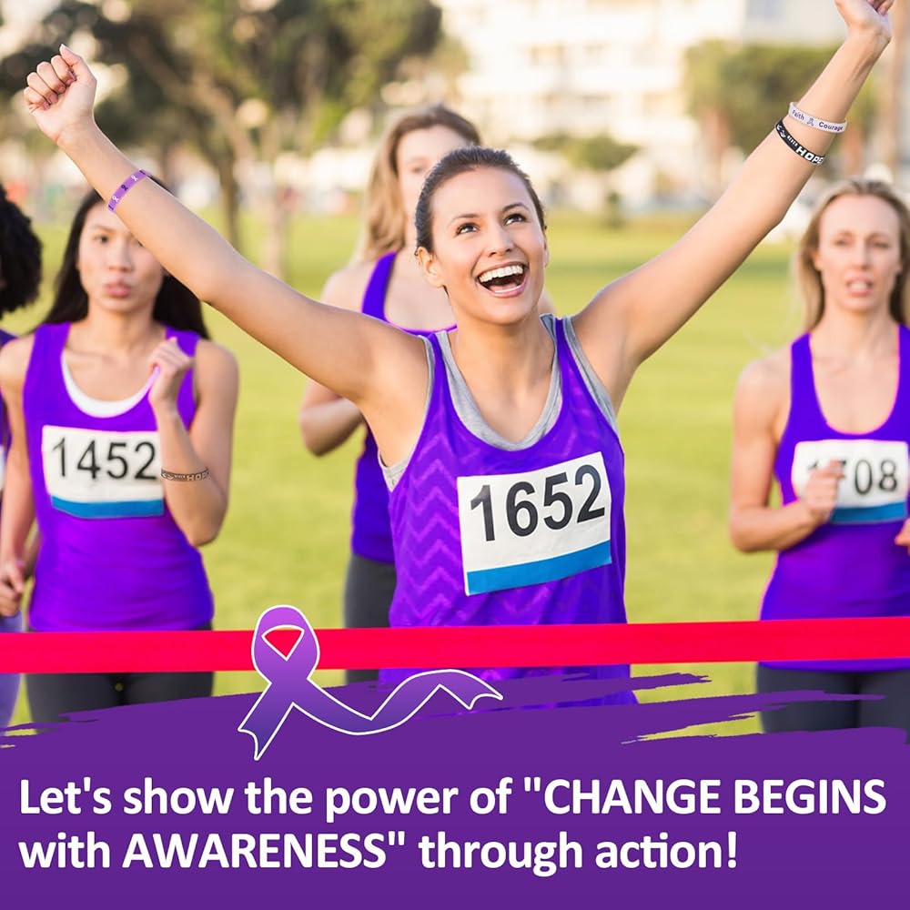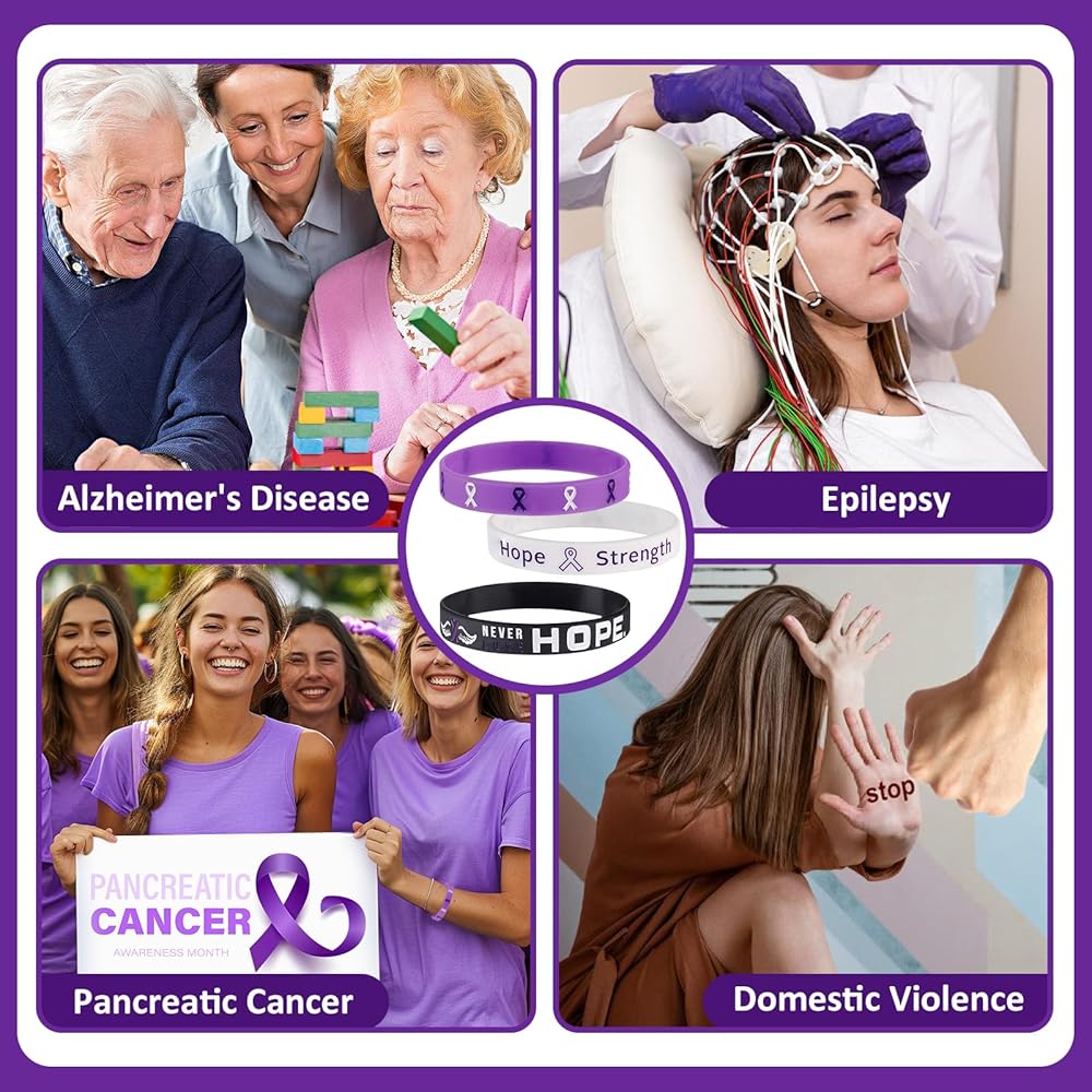 • 💜【Versatile Usage】Our health awareness wristbands serve as reminders for early detection, support, and research across various health issues. They're also effective tools for raising awareness against domestic violence, animal abuse, and more. These cancer bracelets are also suitable for promoting awareness of diseases such as ADD, ADHD, Alzheimer's disease, epilepsy, lupus, pancreatic cancer, fibromyalgia, cystic fibrosis, ulcerative colitis, macular degeneration, and Crohn's disease.
