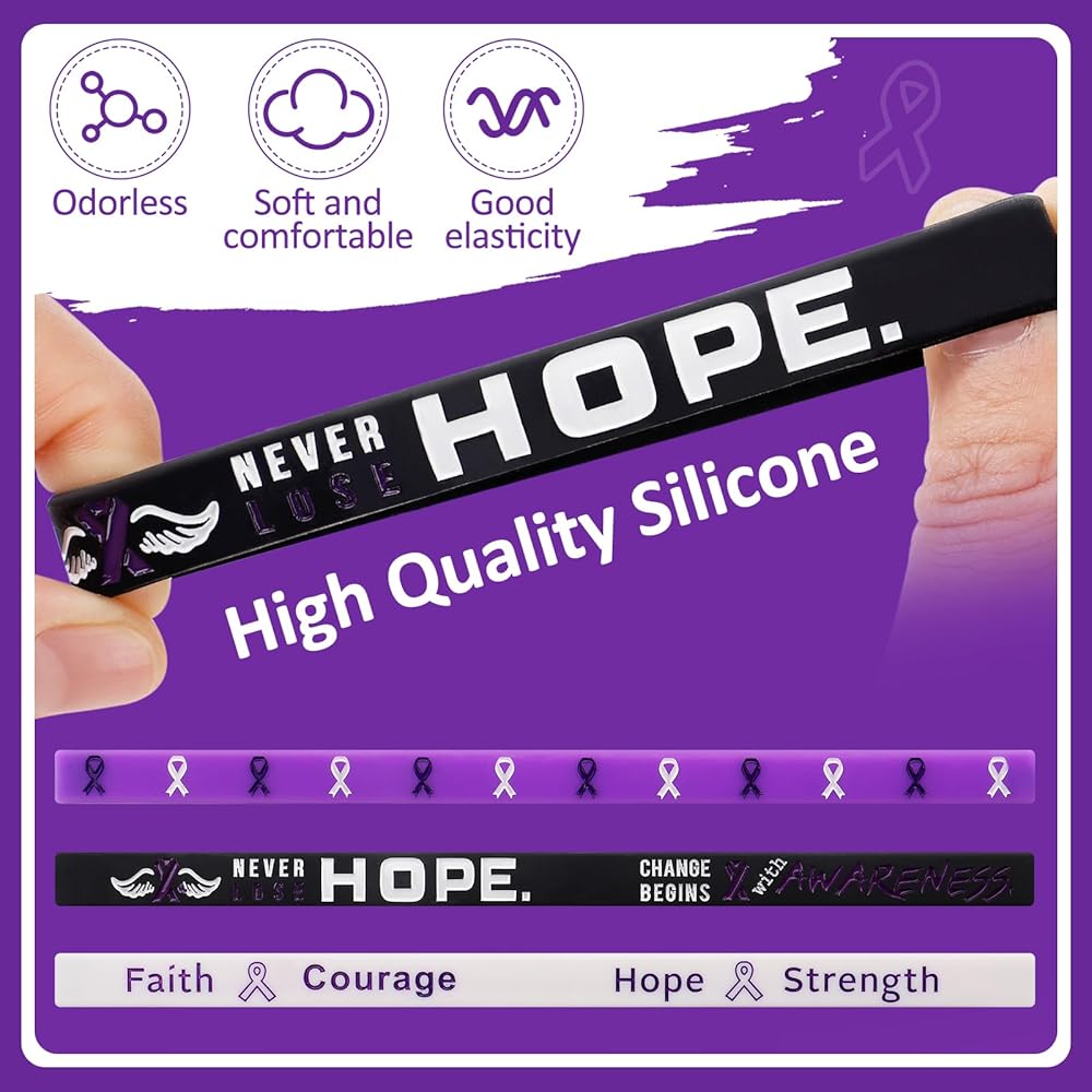 • 💜【Comfortable Silicone】Our awareness bracelet is made of high quality silicone rubber, bright color, not easy to fade. It feels soft and skin-friendly, comfortable to wear all day long. They have excellent elasticity and flexibility and are lightweight for long time wearing without discomfort.