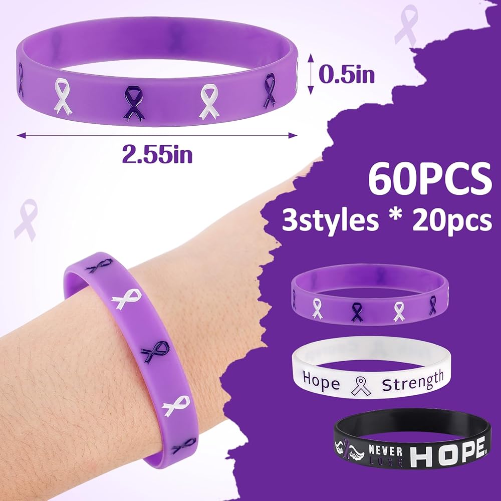 سوار التوعية بشريط أرجواني - 24/48/60 قطعة من منتجات التوعية بمرض الذئبة للنساء والرجال، أساور معصم من السيليكون بكميات كبيرة لمرض الزهايمر وسرطان البنكرياس والصرع وهدايا جمع التبرعات للعنف المنزلي