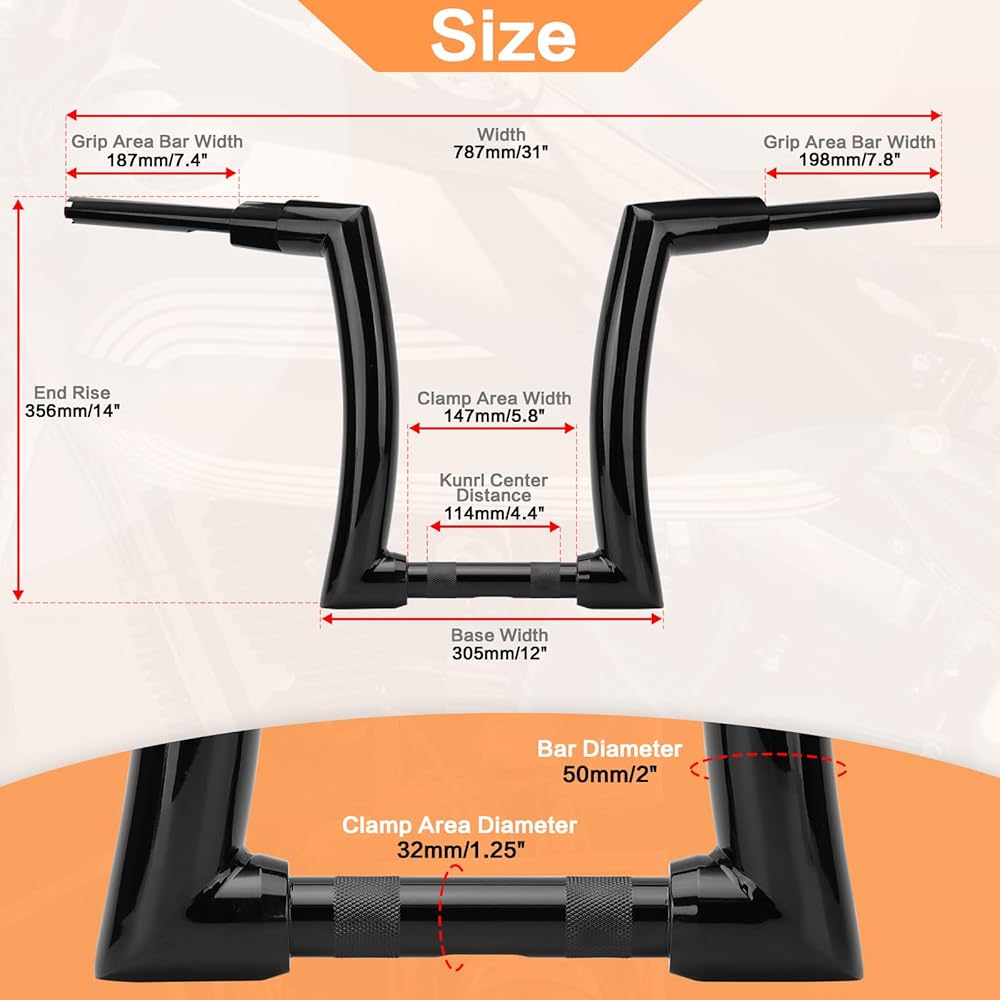 مواصفات شريط المقبض: ارتفاع نهاية المقود 12 بوصة، قطر القضيب: 2 بوصة، قطر منطقة المشبك: 1.25 بوصة، قطر شريط منطقة القبضة: 1 بوصة، العرض الإجمالي: 31 بوصة، عرض القاعدة: 12 بوصة، مسافة مركز Knurl: 4.4".