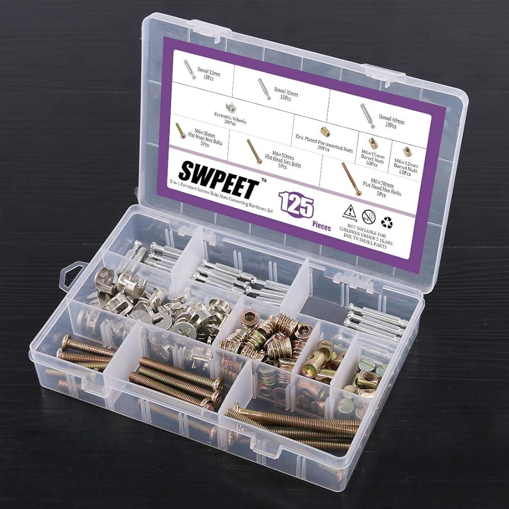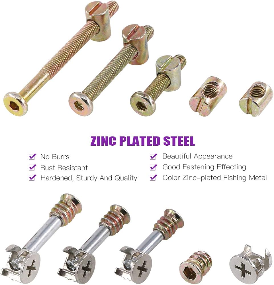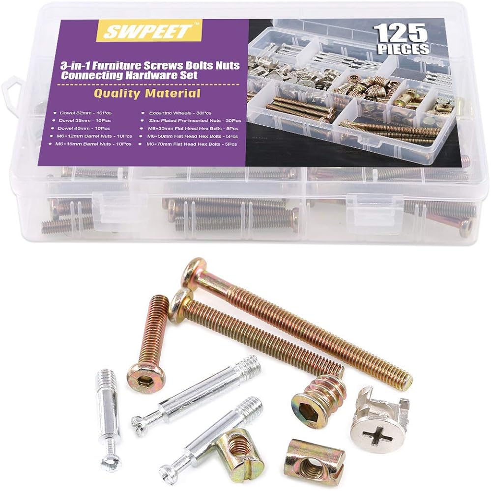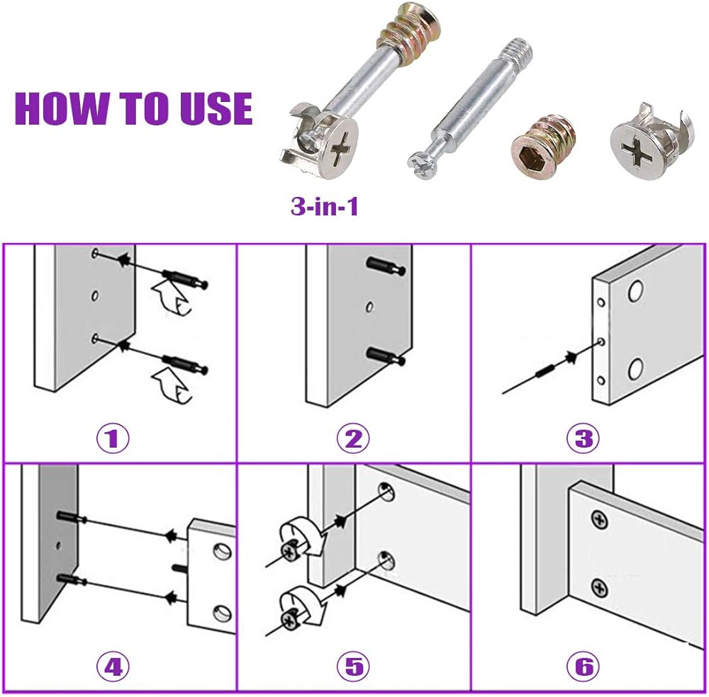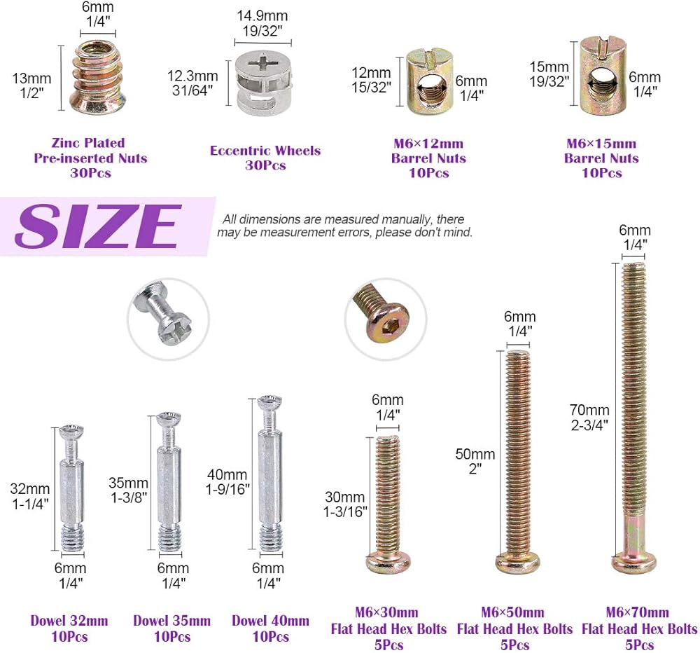 √ 2, 125Pcs 3 in 1 Furniture Connecting Fittings, (30pcs Furniture Eccentric Fitting + 30pcs Eccentric Wheels + 30pcs Pre-Inserted Nuts + 15pcs M6 Flat head hex bolts + 20pcs M6 Barrel nuts ).
