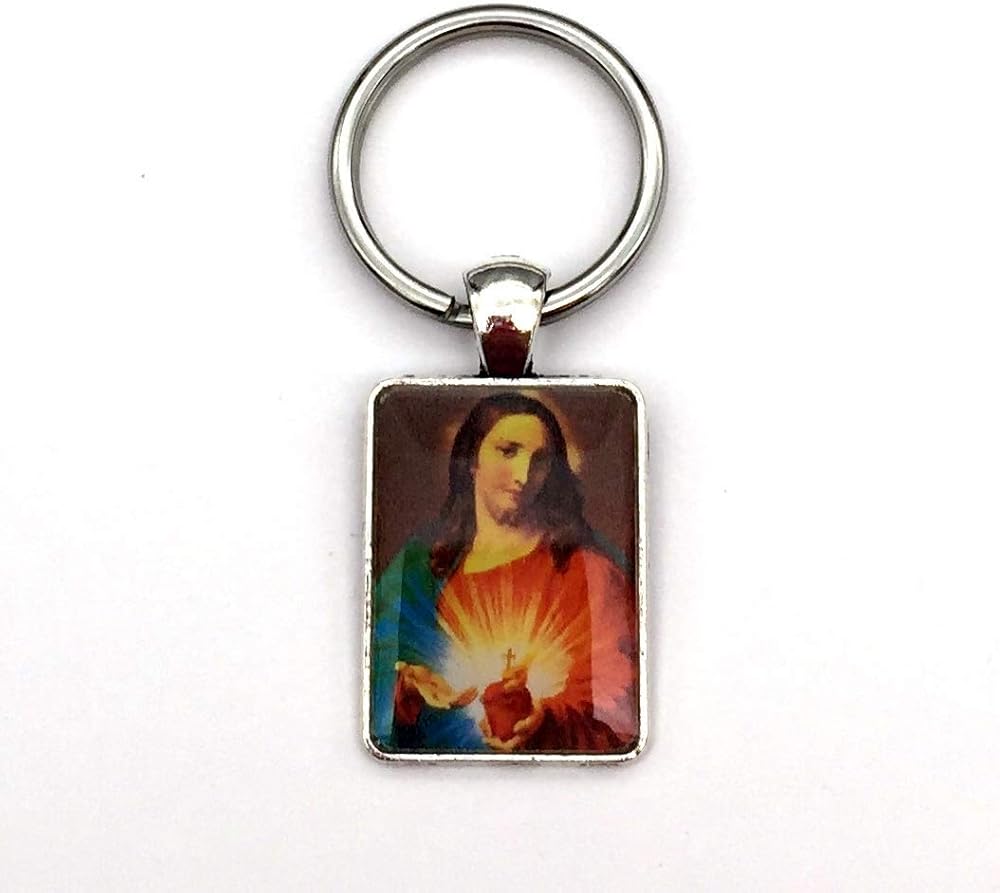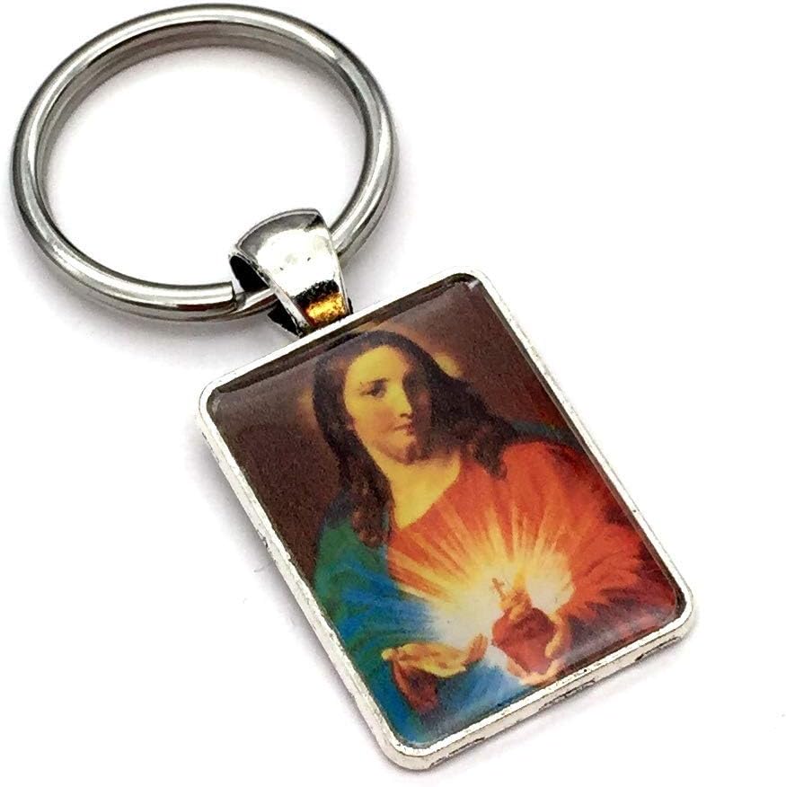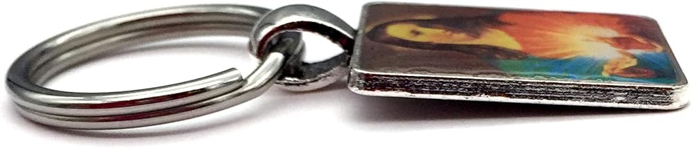 These handmade key chains features an image of Jesus. The image is set into a Tibetan style alloy Rectangle Pendant Cabochon Setting. The setting is cadmium free & lead free, and measures about bout 20 mm wide, 36 mm long, 2 mm thick. The image is permanently sealed into the setting with a jewelers grade resin. The stainless key ring measures 25 mm in diameter (approximately 1").