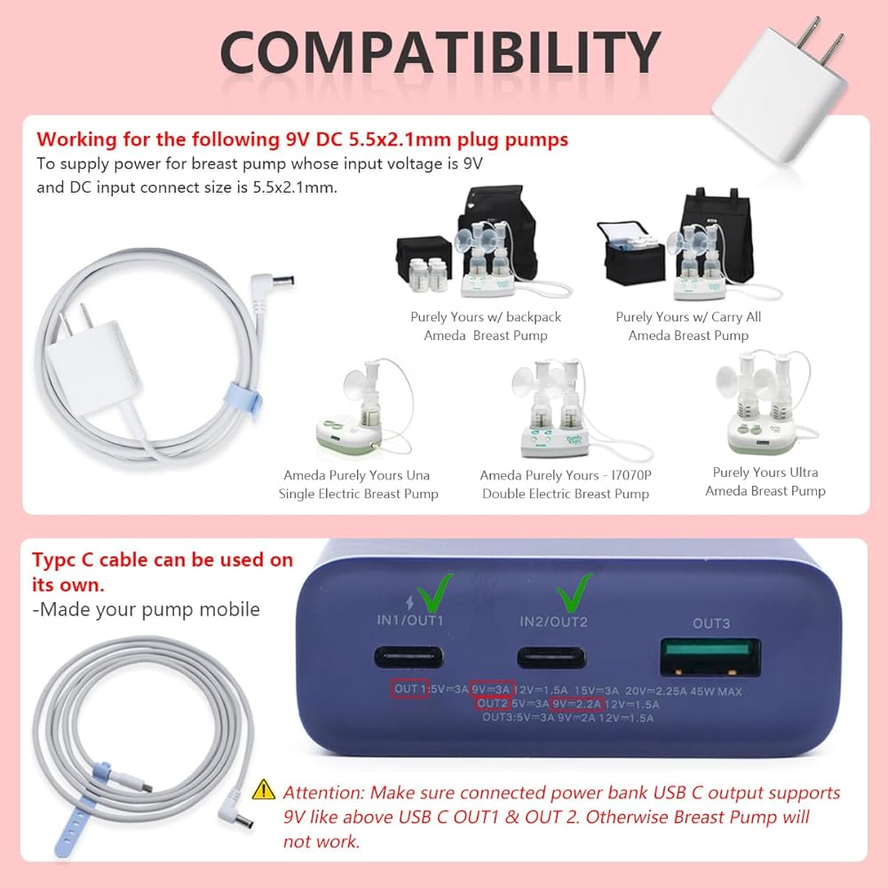 Attention: Working for 9V breast pump with dc 5.5x2.1mm plug. PIs check your pump charging plug size before purchase. Not working if your AC wall charger and power bank is not support PD2.0/3.0/3.1, Not working for 12V breast pump.