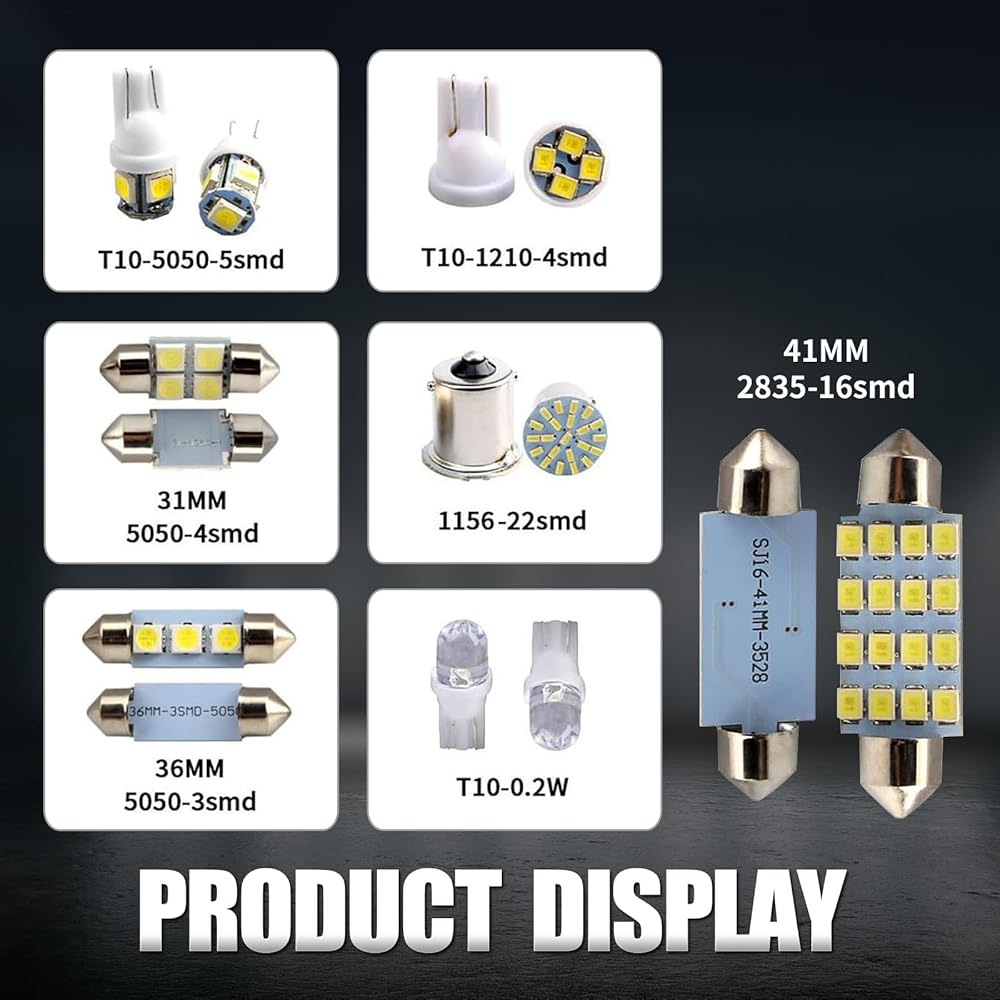 • Package List: The package comes with 42 pieces of LED dome lights interior car lights in 7 models, they are respectively is 6 x 31mm 4smd LEDs, 6 x 36mm 3smd LEDs, 6 x 41mm 16smd LEDs, 6 x T10 5smd LEDs, 6 x T10 0.2W map LEDs, 6 x T10 4-SMD LEDs, 6 x 1156 22smd cornering and brake LEDs.