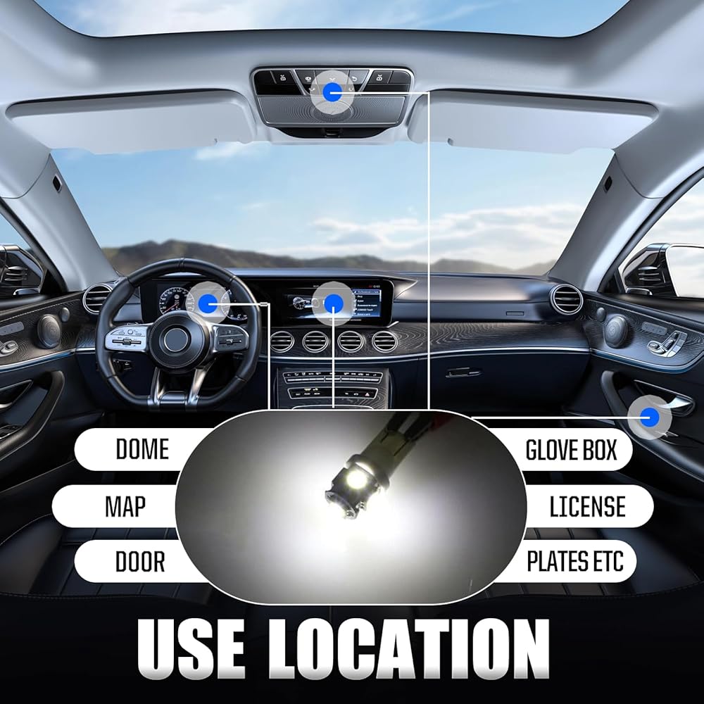 • Broad Compatibility: The LED interior car lights are compatible with various vehicles, including car, truck, cargo, SUV and more. Should fit 99% car and trunk interior light of vanity mirror map dome trunk door and license plate light, front and rear side sign light, etc. Some bulb sizes can not be used for your car, it depend on your vehicle model.