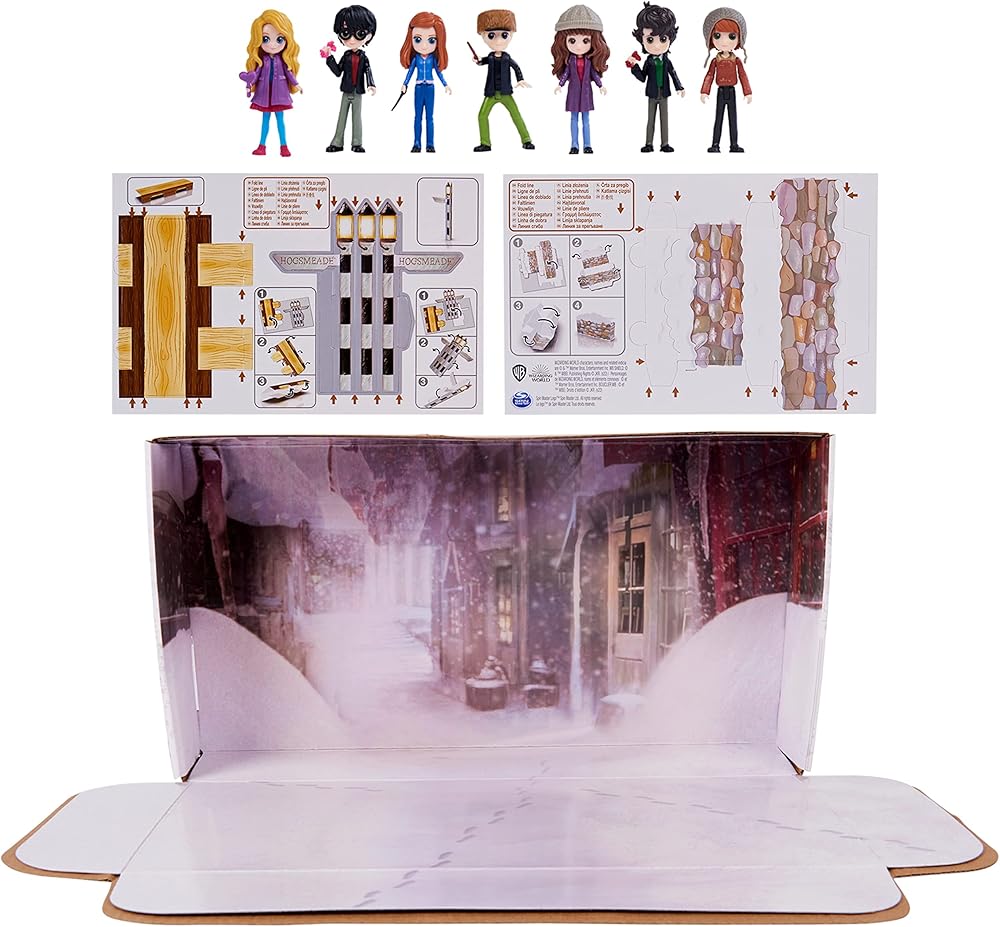 Create endless spellbinding adventures with the Wizarding World Magical Minis Hogsmeade Collector Set! This set of seven Harry Potter figures is a must-have for fans. It includes 3-inch figures of Harry Potter, Hermione Granger, Ron and Ginny Weasley, Luna Lovegood, Draco Malfoy, and Neville Longbottom in their Hogsmeade-themed outfits! Each doll is highly detailed, bringing the beloved Harry Potter characters to life. Once you unbox your dolls, the packaging folds open and doubles as a cardboard Hogsmeade playset. Punch out the papercraft wall, bench, and light post and get straight to the fun! Pose your small dolls to sit on the bench and move each character's head and arms as you pretend to cast spells and play out your favorite movie moments. The Hogsmeade Collector Set will inspire your imagination through fun and exciting pretend play. Expand your Wizarding World with the Magical Minis Hogwarts Castle, Honeydukes Sweet Shop, Three Broomsticks, and the Hogwarts Divination Classroom (doll playsets each sold separately) for even more ways to play. Wizarding World Harry Potter toys are must-have gifts for kids who enjoy collectibles, wands, action figures, dolls, and doll accessories. They're great as a birthday gift, Christmas gift or stocking stuffer. Recreate your favorite Harry Potter scenes with the Wizarding World Magical Minis Hogsmeade Collector Set!